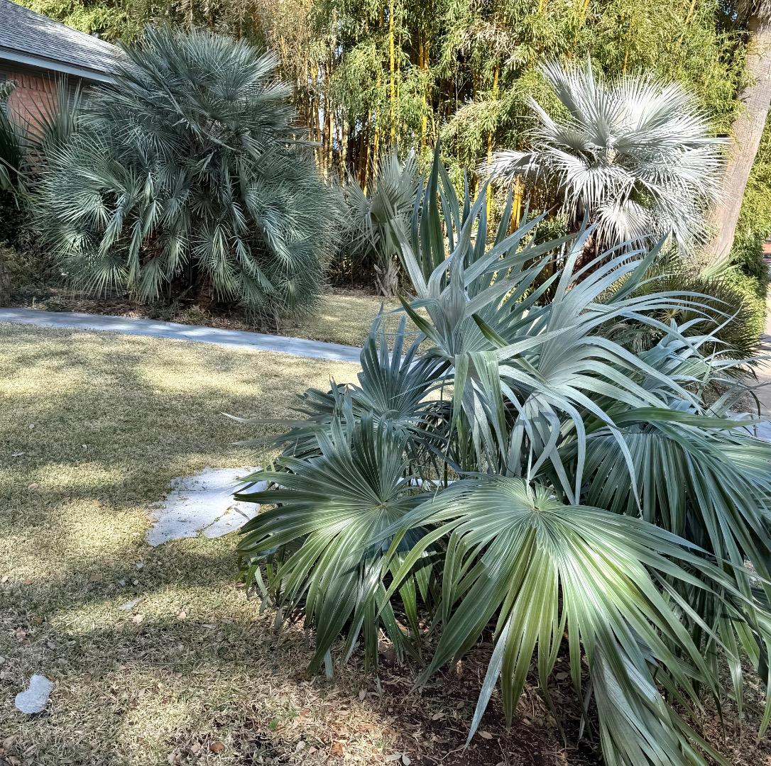 Backyard Queen is by far the tallest. Hard to put an estimate on height. Attached are pics from the snow we got this January. They were not damaged by the snow to amount to much, temperature only got to 31F during that event. January 2025 on the other hand, they were both wrapped with the lights/sheets/plastic method, but only the trunks. They were defoliated just as bad at 12F as they were this winter at 20F.