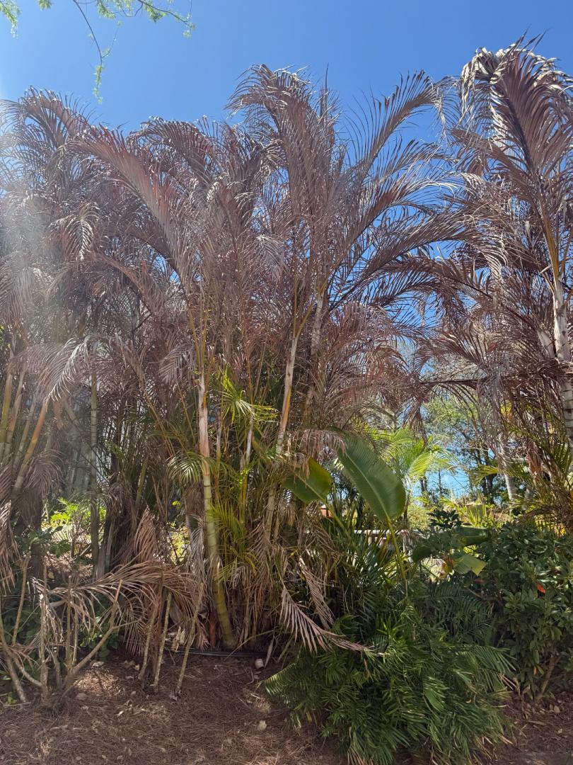Maybe it is too soon to start making conclusions, but it appears C. macrocarpa is no where near as tough as even a foxtail. If you look close enough in the last picture, you can see there is a small foxtail that experienced the same brutal wind and cold that is opening a new spear. My Roystonea got a little fried on the more horizontal fronds but has already opened a couple new spears. Bismarckia did fine in my yard, but I have seen some fried not to far to the north and east of me. I have a stretched out bottle palm under foxtail canopy that prematurely dropped a couple fronds but otherwise seems ok. C. lutescens got a little toasty on top fronds but have been pushing out new fronds like nothing happened. C. probably cabidus (i ?) by the little coconut got a little crispier than lutescens but all the stems have opened new fronds. The P. elegans took a little too frond damage and maybe have prematurely dropped some fronds but all seem to have opened new fronds. R. rivularis seems like nothing happened. My last and final Adonidia still seems alive but looks like crap. I may have posted this already but I will reiterate that more wind sheltered areas of my yard somehow took more damage in this event (frost). My back yard is wind sheltered from the north by I have no actual oak or pine canopy, only palms. Frost still seems to my biggest enemy. The north side, front yard looks like nothing happened, foxtail and C. lutescens being the canary in the mine. It has been a good learning experience. I’m probably going to try any more coconuts or Adonidia. C. macrocarpa is a letdown too, it really needs canopy here. Foxtails and Roystonea still win, C. lutescens wins too, and Bismarckia. No wonder these are the more common palms sold here. -