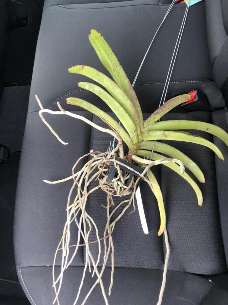The flower reminds of Epidendrum falcatum or parkinsonianum but not the leaves. What a pleasant surprise. This bloom is a pleasant gift coming out of the boot of a Pritchardia. I cut the start off a larger plant which has been in my gardens for well over 15 years but the parent isn't blooming right now. This cutting has been bouncing around the garden with this boot being it's latest host. Parent plant shown below too. -