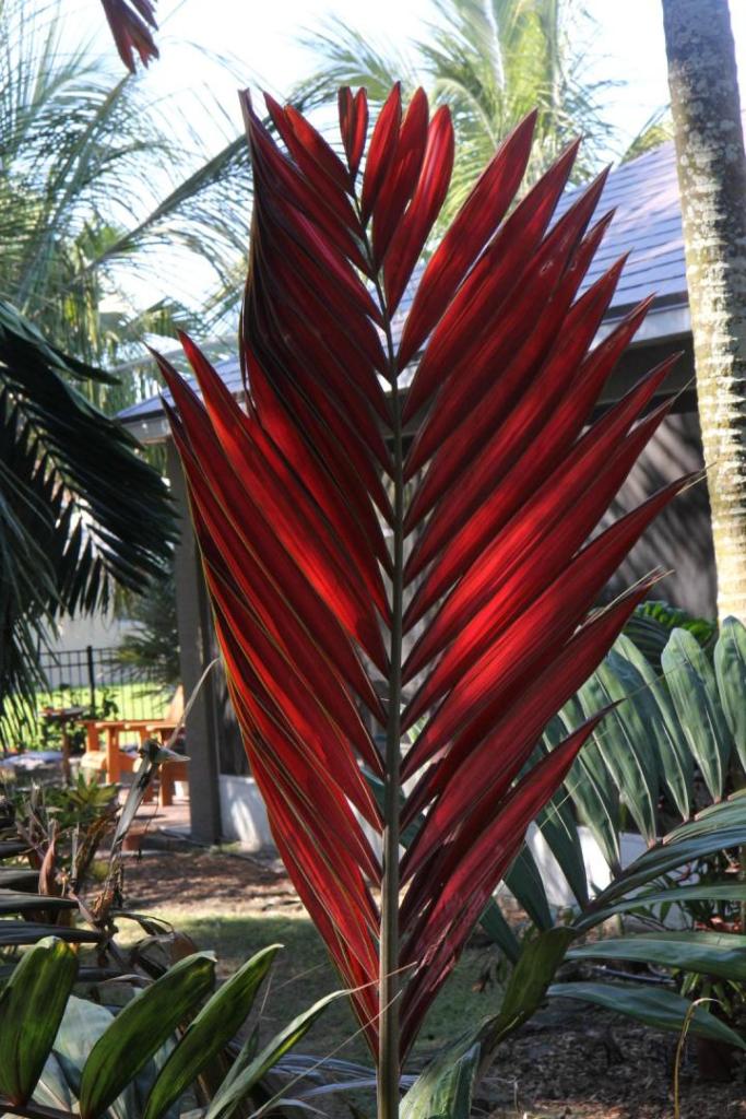 these two pics are 1 minute apart. first one is sun at the back, dark red as this p[alms has lots of anthocyanin. Second one shows transmitted light through the same leaf a minute later, like fire, not so dark. High sun intensity led to good intensity tramsmitting the leaf when compared with the first one a reflection which showed lots of deep red but low intensity. The back reflectance of light was low compared with the transmitted light coming through this leaf. first sun at the back of observer: second with the palm between the sun and the observer showing some transmitted light, that is actually a different color. then minutes later with less cloud cover flame on! -
