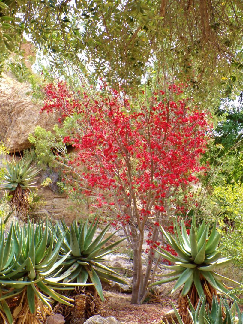 ....So for as many years as i have been taking mental notes of what grows in the garden here, one of the " standout " rarities, tree -wise, is a small -ish Legume fam. tree from Africa.. One i was somewhat surprised to see growing in the garden at all < ..Was my assumption that AZ might be a touch too dry for the genus. Seems to grow pretty easily in S. Cal though. > Regardless, there they were, growing here and there around the garden, happy as pigs in .... Still, despite near yearly visits in the spring, i'd never seen flowers danglin from any of them, ..until yesterday.. ..I also did not realize the garden has as many specimens as it does ...until yesterday. What is this red flower covered thing lurking behind the Aloes? Say 'ello to my little Schotia afra. The highlight of this springs' visit.. Cat calls n' all r' welcome. As vivid as the " near leafless while flowering " specimens are, no way you or i could miss seeing them.. Far more interesting than flowering Plums / Prune or Quince too. ...Another intriguing ...." What element / combination thereof about this winter triggered these " mystery.. Again, this is the first time i've seen flowers on any of the gardens' specimens. Additional huge plus regarding this Genus ..afra in particular.. Absolute Hummingbird ..and Oriole... magnet.. Hummingbirds were fighting over favored spots in each specimen seen. Would bet Common Yellowthroats, Geothlypis trichas ..a New World, Warbler - esque bird that appears to have recently taught itself how to pollinate Strelitzia while trying to get at copious nectar in the boat - like portion of the flowers in parts of California might also be attracted to these. Not quite as showy, but pretty interesting itself, Bulnesia retema, a weird Creosote / Guaiacum relative from Argentina that could pass for a South African Euphorb when seedless / not in flower. >>>>>>>>>>>>>> -