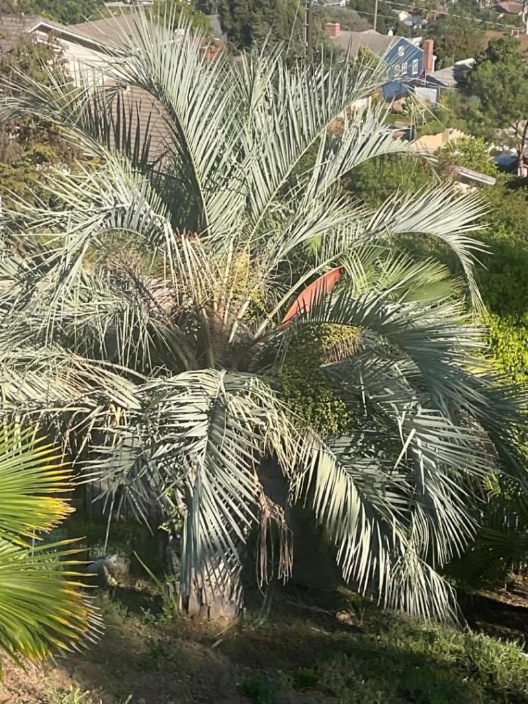 I have tasted the fruit of mine because I had heard they made jelly or jam out of them. It was like a sweet apricot flavor but mostly seed. The squirrels love them! The inflorescence is a pretty pinkish /red color that shows up in the silver back drop of the palm. I have only had one volunteer after almost thirty years of growing it . The Syagrus have volunteers everywhere. I think the squirrels and birds keep the fruit from falling off the Butia , unlike the Syagrus. Harry ‘This was last summer after trimming . I used quite a few band aids ! They have very sharply thorned petioles. I don’t have a picture of the colorful inflorescence right after emerging the spathe but this shows the fruit prior to ripening . Good luck getting to it , I would not stick my arm in there! You can see the spathe is very similar to Syagrus. (Reddish brown) -