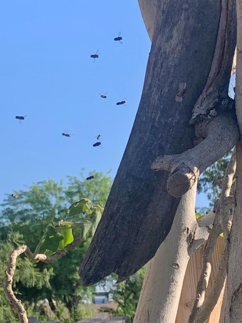 One of ...several possible.. locally common species within the Genus Megachile swarming at one of their branch homes up in the Ficus out back. Very important pollinators of several plants ranging from various native wildflowers and trees like Mesquite and Ironwood ( Olneya ), to important crops like Alfalfa and Citrus.. No doubt, now that they are out, bigger Leafcutters will emerge shortly, if they aren't out already. Pontia protodice, Checkered White. For whatever reason, these have been quite abundant this year. NOID unusual surprise Raptor appearance.. After going through the list of all our locally common raptor species, ..inc. the rarer " tropical " sps that sometimes wander north of Mexico, and i can't pin this one down.. * Not an Osprey or a younger Bald Eagle ..The two " most likely " candidates that have a white neck / head ..and/or tail. Definitely not a White Pelican either.. * Too big / wings not set at the right angle to be a Kite ( White - Tailed would be the " commonest " sp. seen here. No forked tail so ..Not a vagrant Swallow Tailed Kite wandering thru AZ ) * Wings and size aren't right for Caracara either.. Counting the days until i see my first AZ specimen though.. Flew just above the houses from a nearby Eucalyptus where visiting Hawks and Owls like to hang out when in the neighborhood but was circling much higher up by the time i grabbed the phone to get what ..so so shots i could grab before drifting off.. 40 years of seeing ..pretty much.. every Raptor sp. native to CA. AZ, and FL, ..and KS / Ohio... Never seen any with this color pattern. ..Whatever this is, it is very unique..