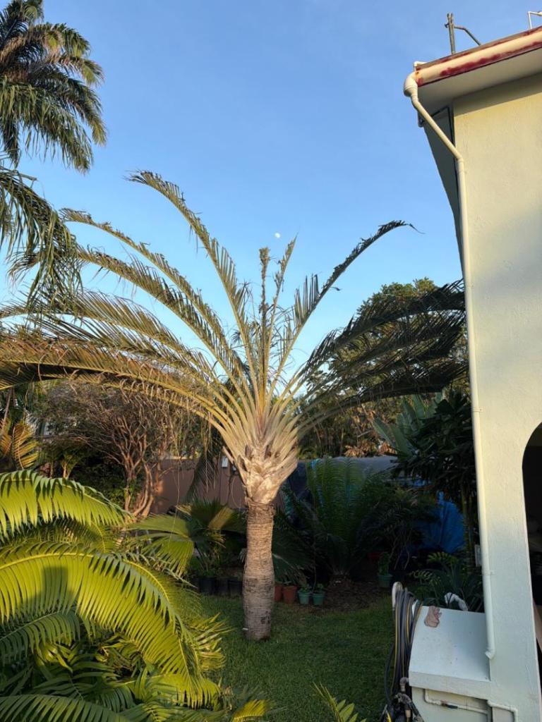 A few more photos of my palms. The first is Coccothrinax crinita sp. brevicinis Dictyosperma album Ravenea hildebrandii in the middle of a few Encephalartos Here’s an unknown Dypsis with a Wodyetia and A alexandrae in the back ground Arenga hookeriana clump. It’s hard to keep these looking good here. A clump of Hydriastele rostrata (?) The moon raising over C. decaryi. I just noticed the new fronds look bad. Not sure what’s going on but hopefully it recovers. I’ve already lost 2 of these. Moquitos are coming out. I’ll continue posting a few more photos in the morning.