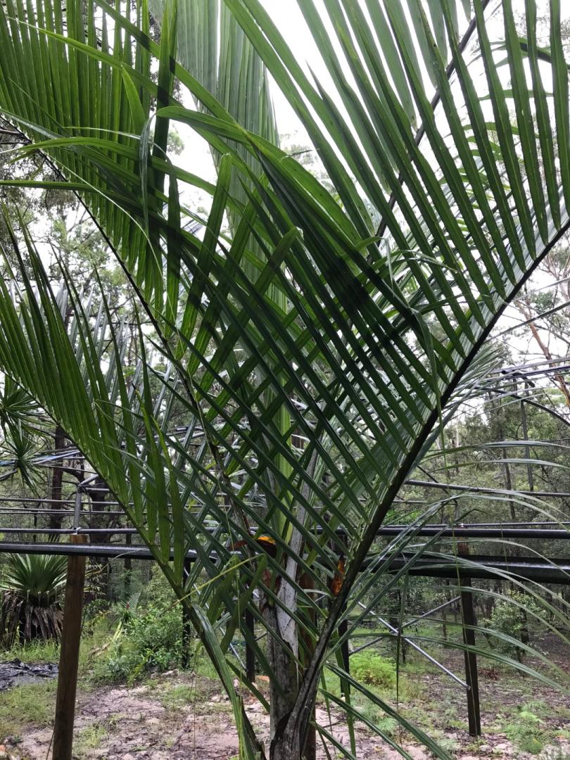 Chambeyronia oliviformis powering on and opening a new frond yesterday despite a maximum of 44C/111F with 75km/h (46mph) winds. Tough palm. The nearby Chrysalidocarpus lanceolatus which also decided to open up a frond in the oven wasn’t so lucky. The heat and wind sucked the moisture from the frond and it wilted quickly.10 points