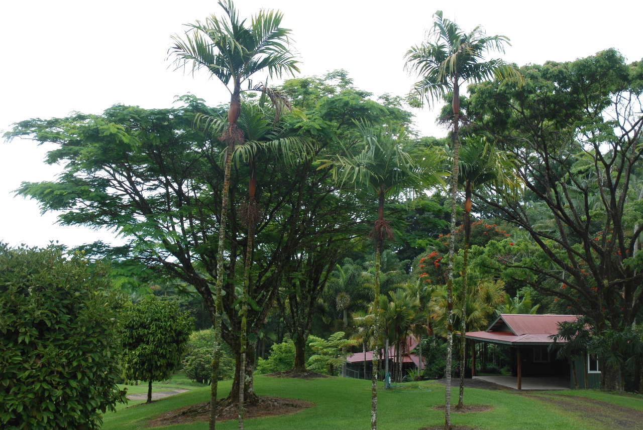 Continuing on the wrap-around-lanai and making a 90 degree turn, we are now facing the valley side. There's a very dramatic drop straight down on this side of the house, and you find yourself looking at eye-level onto a number of palms, with about 20 ft of trunk BELOW you. The bottom of the valley is another 100 ft or so further down. The Pacific Ocean, not visible in any of my photos (partly because of the weather, and partly because there are so many palms in the way) is about 3 miles away, or so. Here are a couple of Chambeyronia macrocarpa. Not the most exciting palm, but this is what's close to the house!1 point
