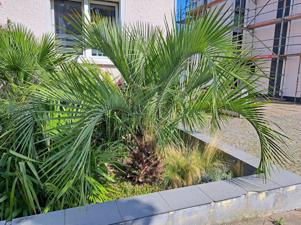 I wouldn't really call it a garden, but I'm semi-experimenting with palm trees in El Centro, CA, in the Sonoran desert. I don't have any land, so am planting them at one of my works and unfortunately it is under construction and irrigation is frequently cut off when I'm out of town and I return to many dead palms. It's very frustrating. Anyways, I've had fun experimenting with palms, and have unfortunately had many untimely deaths due to irrigation being cut off or getting run over by construction machinery. I'd like to highlight the African oil palm, however, and ask if anyone else has tried them in California or Arizona. This palm is 2 years old from seed. It has spent one summer and one winter in a pot and one summer and one winter in the ground and has been tolerating FULL SUN from noon to sunset on a west facing wall without any issue! I am so shocked. It is frequently 120 F here.2 points