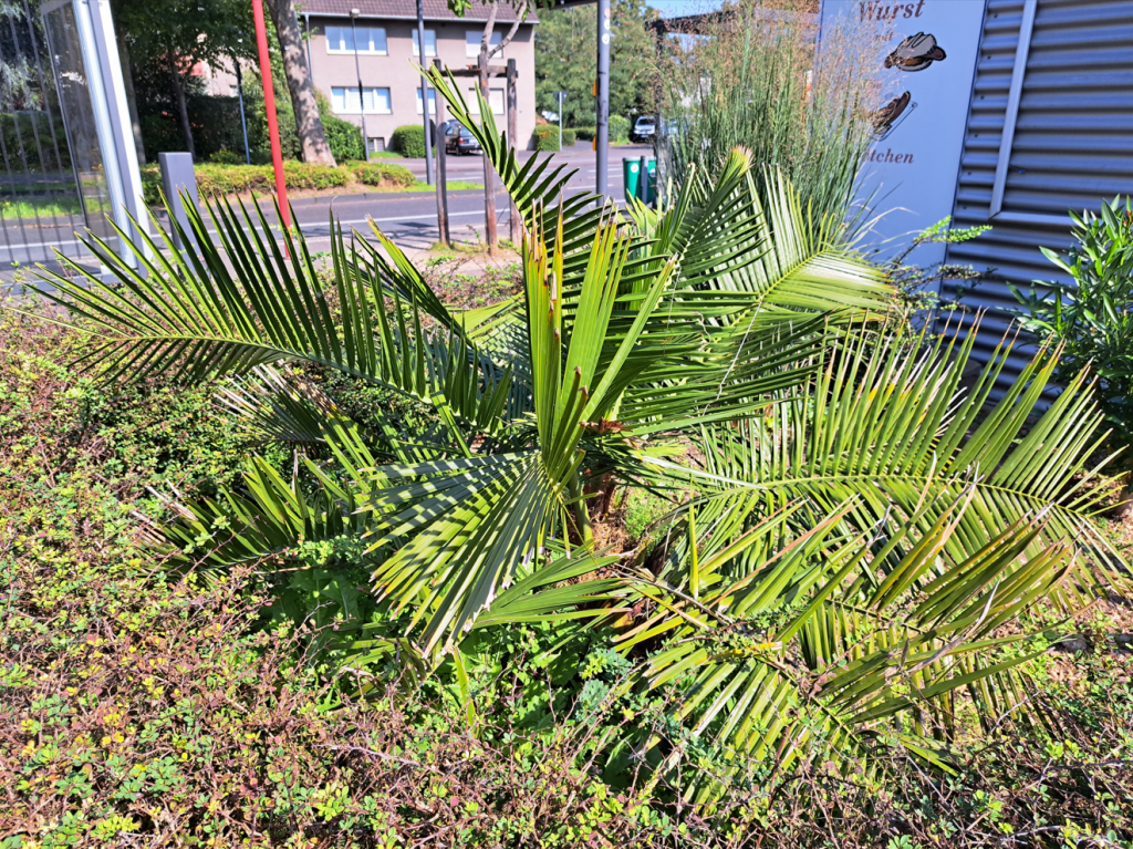 I used the Sunday's quietness to take some updade pictures. I'm also including some other species than Jubaea chilensis in this post. Despite a couple of heat waves in the winter it was overall a bad one with lots of humidity and several freezes. I was curious at how these plantings fare. Some of those Jubaeas don't look that great while some others look very nice. Sabal grew quite a bit in a year. There seems to be another feather palm in there. Not sure what it is... Nicely coloured Opuntia. Needle palm. Quite rare here. I once had one but dug it out and gave it to our Botanical Garden. Next time I might check out what's planted on that roundabout. Looks interesting... This Jubaea grew quite a bit in one year and also looks the best. Those pictures don't do justice to how big the trunk is for such a small palm. Compare base to the car. Phoenix canariensis which could become a problem so close to the wall. Might help in bad winters though... Brahea Another nice looking Opuntia. Olive tree with fruits ripening. Also have some in my garden right now: I believe this is another Needle palm. Butia Another Sabal I only discovered now. There were also some Pinus pinea I never noticed. But quiet common here in private gardens.1 point