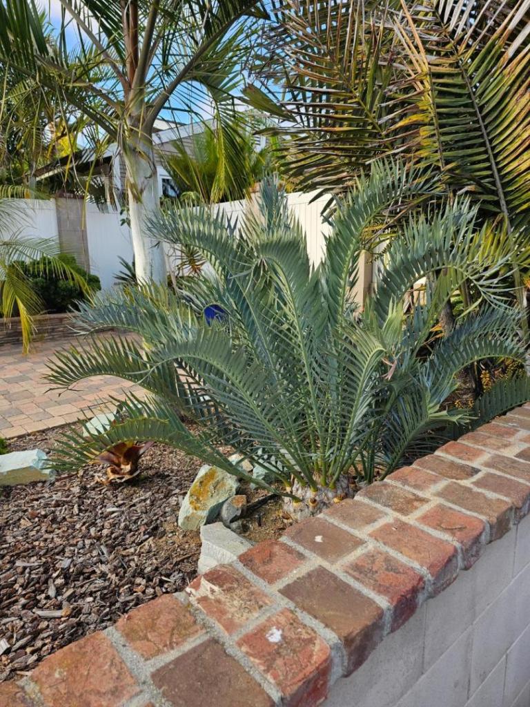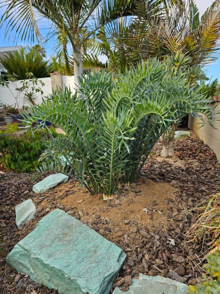While I have an established 20 year old Bismarckia nobilis in my garden, I hesitate to recommend them here in California because they appear to be a second line favorite of the South American palm weevil. I have plenty of blue cycads and a large colony of Puya alpestris to contrast with my green leafed Chrysalidocarpus ambositrae in the front of my house. As previously mentioned, Chrysalidocarpus ambositrae is still relatively uncommon in gardens with its deep green recurved leaves and white retained petiole base. Bismarckia nobilis has become much more common with big box stores selling them here for over 15 years.. The blue cycads are still hardening off so haven't attained there full color yet. The palm is a Cocothrinax borhidiana hybrid which is in front of the green leaf Chrysalidocarpus ambositrae. I also have a pale Aloidendron dichotomum in that front planter area to create a color contrast.2 points
