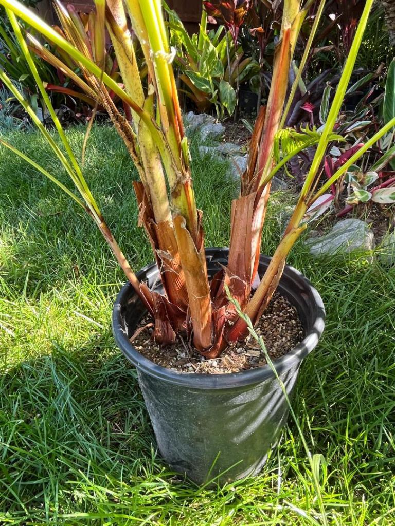 Heavenly! And fun to see several palms that aren't seen much where I am on the West Coast. I assume the current Dypsis decaryi location is temporary? It's a great-looking arrangement in the short-term. I also love the pops of color (esp the purple flowers in the first pic, and decaryi arrangement). Maybe see if you can slip in some red, pink or purple foliage in the planter behind the bottle/spindles at some point (to further emphasize what is already a gorgeous arrangement). 🌺2 points