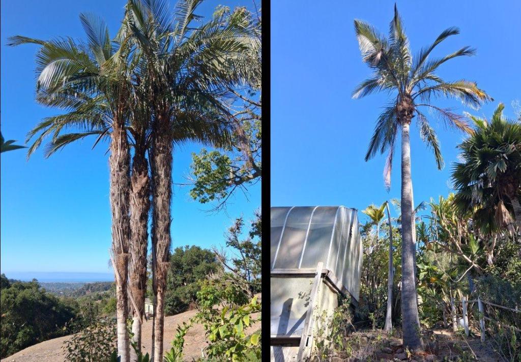 I recently became caretaker for my father's place in Santa Barbara, including his palm tree collection. I have a question about the growing habits of the mature specimens. Below is a pic with a trio of Parajubaea cocoides on one side, and a single P. cocoides on the other. The trio is 15-20 years old, and has the classic hairy-looking trunk. The bottom 10-15 feet or so are smooth, having dropped the frond bases entirely, but from there on up the trees are holding tight to the remnants of the dead fronds. The single P. cocoides on the right is well over 50 years old. As you can see, the trunk is smooth almost to the top. It appears to me that P. cocoides begins shedding its fronds as they die once it reaches maturity. I really want to be right about this. I want someone to say "that's right, you won't need to trim the older tree at all, it will simply drop its fronds like a King palm." Because that would mean that I have one less really tall palm tree to trim. Does anyone know what these trees are like at this age?3 points