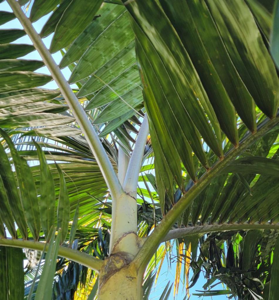 Well I figured I would join the conversation. Better late than never. My hookeri has more of a yellow green petiole and rachis rather than the chocolate color some others have. The crownshaft also shows some marbling like the watermelon variety, but still yellow. A definite hookeri variety. Has 6 foot of woody trunk before the crownshaft. The pictures are from this morning showing the fading leaf that opened last week. Opens very deep red. Note the petiole and rachis color and the crownshaft color and marbling. Two days ago I planted my houailou palm from a 7 gallon. It's opening split leaves now. The petiole is definitely a yellow and leaves are stiff. Rachis has a kind of peachlike color. Very stiff. Forgive the sunburn. At first I put her in too much sun. Now she should grow into it, hopefully without the burning. Leaves not as " puckering" like the hookeri. The last leaf to open showed it's first small bit of peach color. Just a bit. I expect more color as it matures. Grew at a steady pace in the pot, opening more leaves than my hookeri. Feel free to rejoin the conversation and share your thoughts.3 points