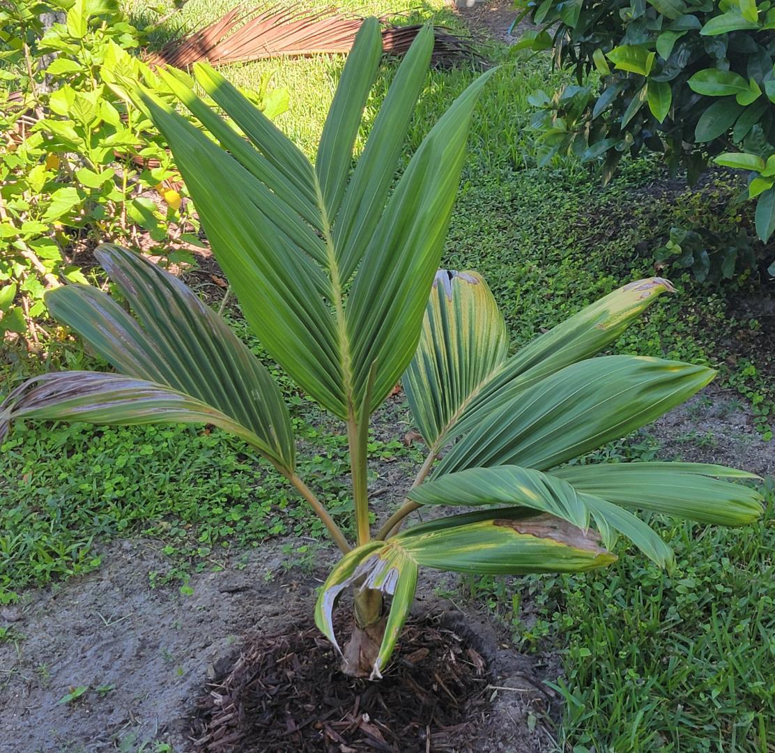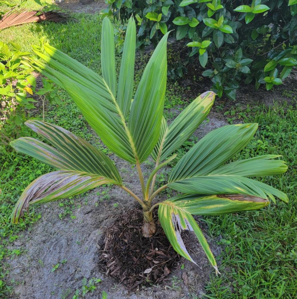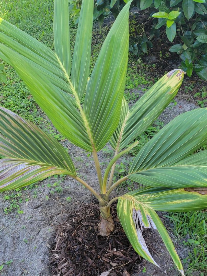 September 27, 2025 This big coconut will now officially be two years old around now. Im on my ladder today. So a different view. I chopped and dropped a ton of passion fruit vines for mulch. 2 nice new leafs coming in. Sorry about the mess lol This one is kind of harder to see but it has some nice big leafs now4 points