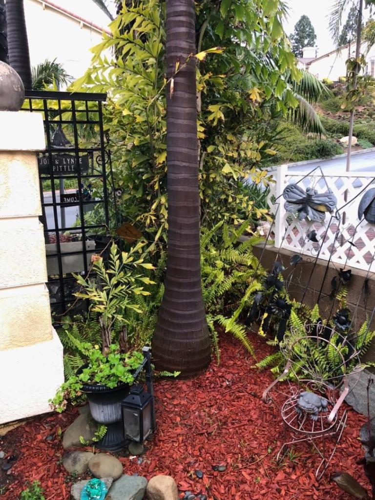 I use wood chips around my plants . It works well year round and really helps insulate during the hottest months . The plants love it and when it breaks down I just add more. Harry ‘This is during the winter after the rain. The water loving Archontophoenix Alexandrea needs moisture even in the top layer and the chips help keep it from drying out. This area gets very warm and dry in the summer and fall months.2 points
