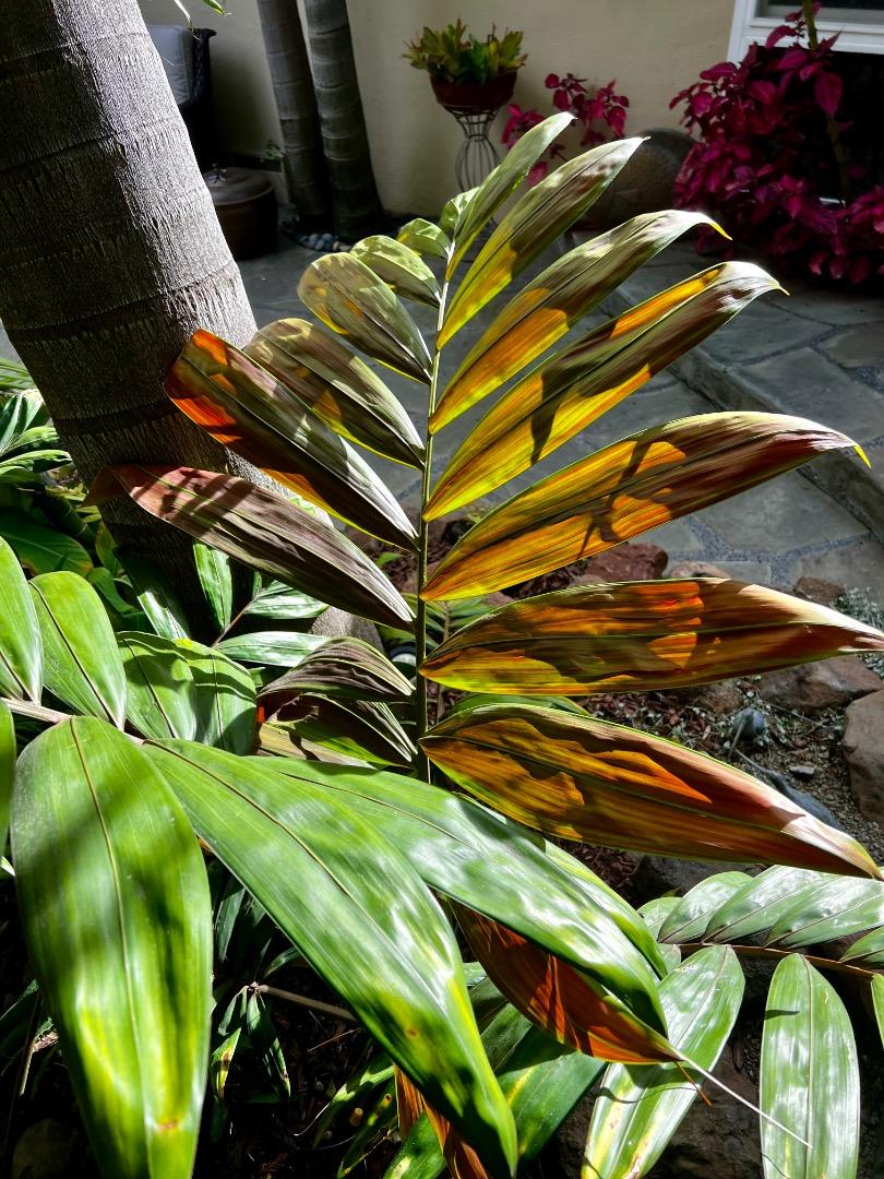 Been awhile since I posted an updated photo on this palm. Night time temperatures have finally been consistently in the 60 degrees F. range and the large overhead shade trees filled out entirely to provide filtered sunlight for this houseplant; time to move it outdoors for its summer vacation. Gusty winds always a concern though. Been holding off putting my Joey palm outdoors.1 point