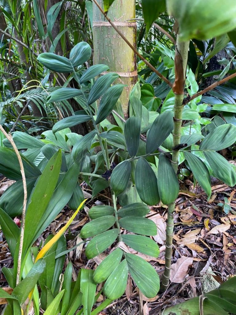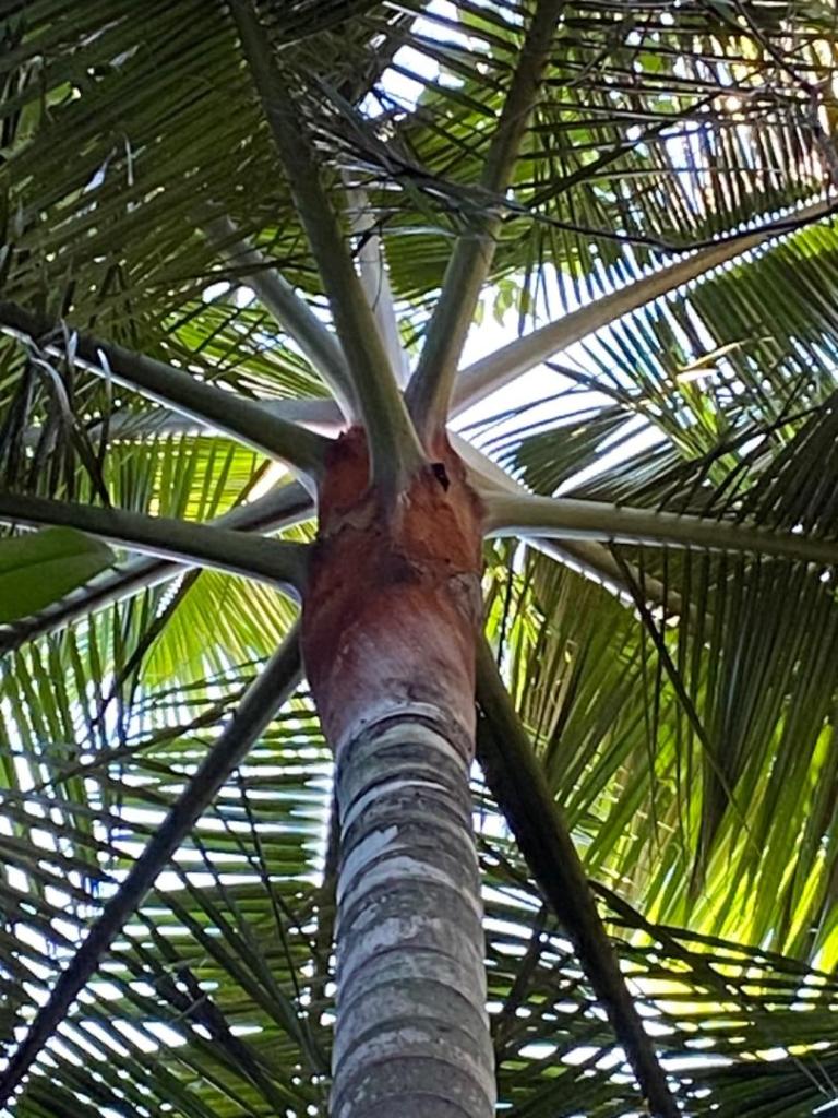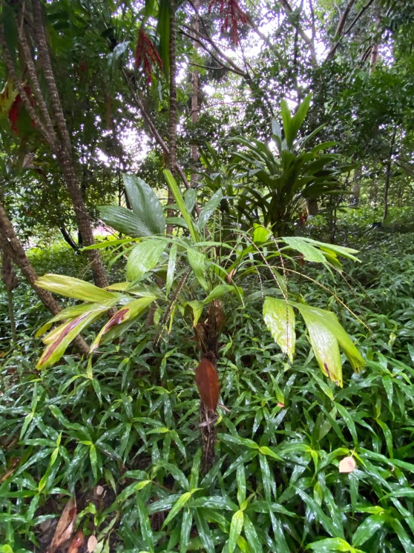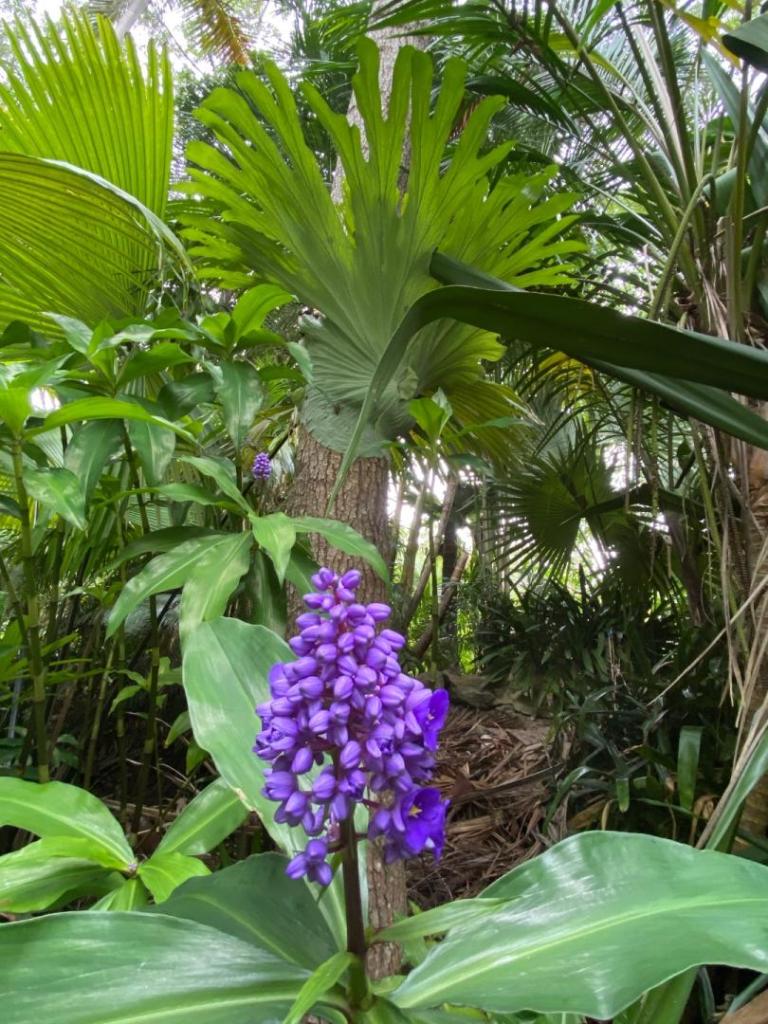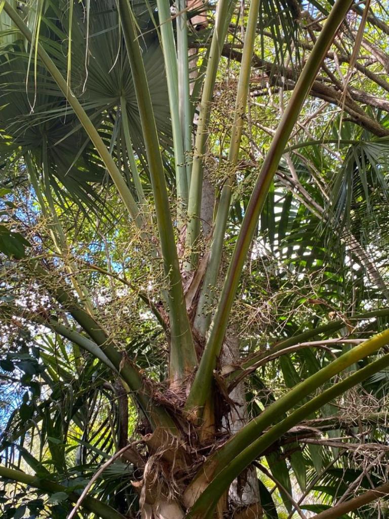 Next, the best Trachycarpus princeps I’ve ever seen. Interestingly, they won’t grow very well here near the coast. But a slam dunk in the dryer air where he lives. Followed by a canopy view with a Livistona decora poking its head out. As his canopy has expanded, what used to be impossible for him to grow, is no longer out of the question. Case in point, Becarriophoenix alfredii.1 point