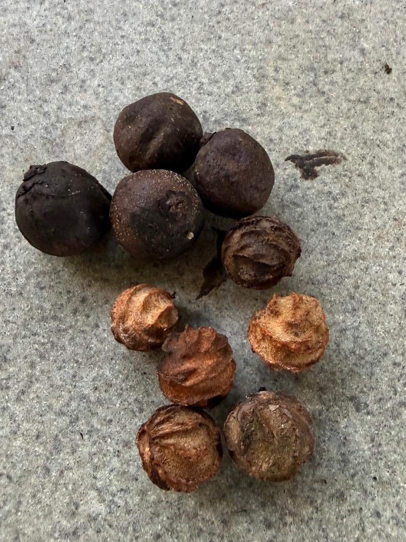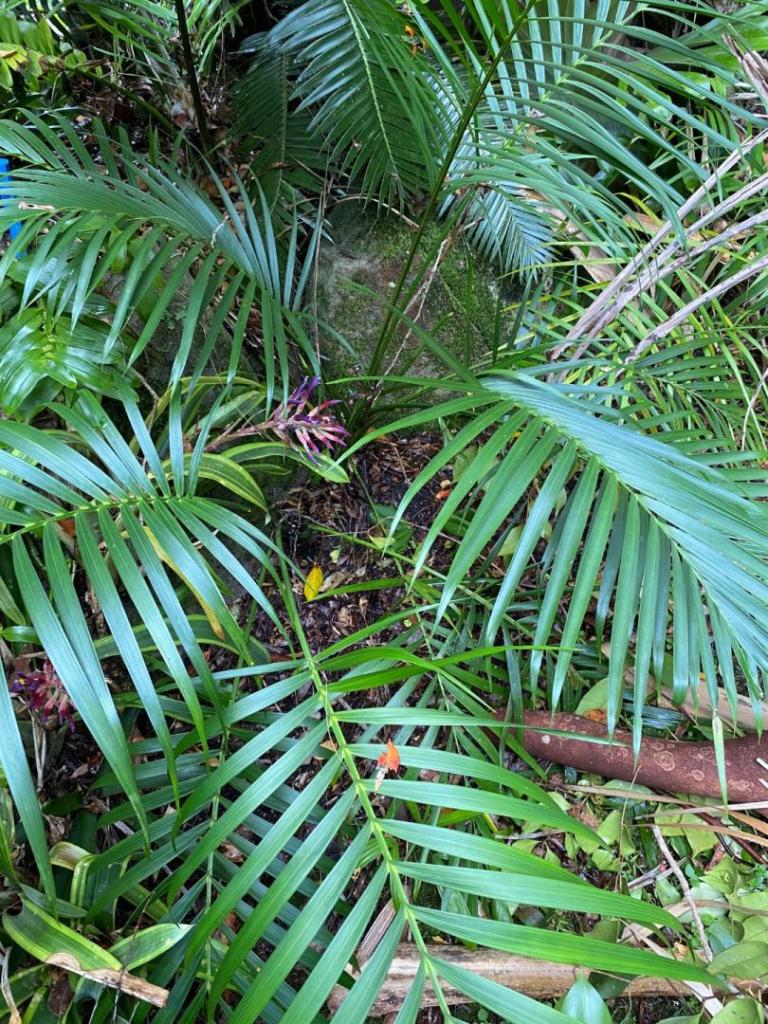 I was out cleaning up this part of the garden and did some trimming on this Decipiens hybrid which makes it easier to get photos of it. Also, for what it’s worth, I was speaking with a friend about this palm. He is familiar with the original garden this seed came from and mentioned that he believed the Decipiens crossed with a Baronii which is close by. In the past I thought it was crossed with a Madagascariensis type palm that is right next to the Decipiens, but none of these hybrids, to my knowledge, showed any irregular leaflets which crosses with Madagascariensis always seem to show. Supposedly, Decipiens and Baronii are very closely related on the Chrysalidocarpus DNA tree. That would explain many things about these hybrids. Not just their appearance, but also the fact that so many hybrids happened from the 1 seed batch, and now the hybrids themselves are making plenty of viable seed. I’m no expert but I wonder if palms that are so closely related hybridize, does that create a somewhat new species? Or a variation?1 point