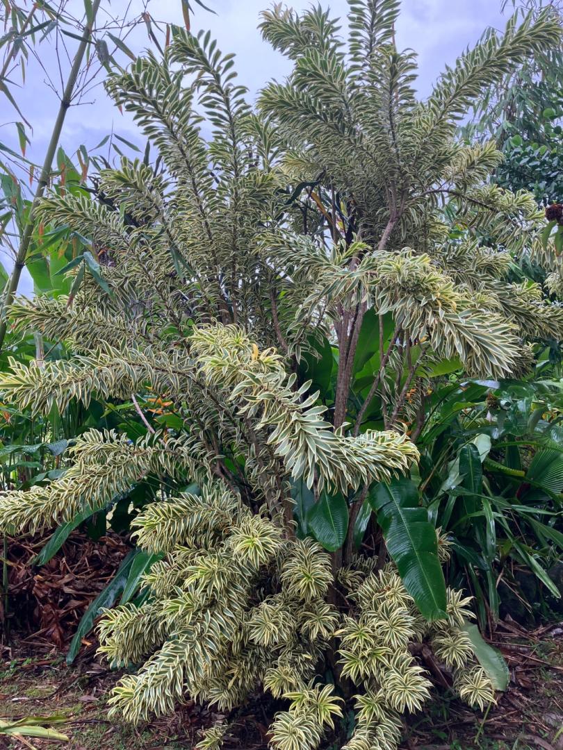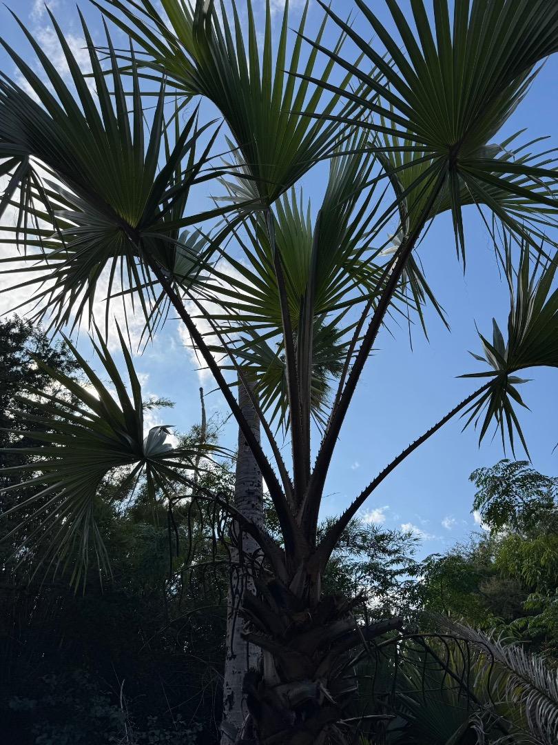 I was out on the side of my house and the light rain turned into a deluge so I ducked under my Pritchardia . A perfect umbrella . It was a brief downpour, as soon as it let up I got inside. The only Keridoxa I have seen in person was in a glass house at the Huntington , could’ve put the whole family under that frond . Harry ‘Perfect one person umbrella , Pritchardia H. This one would be for the whole family!1 point