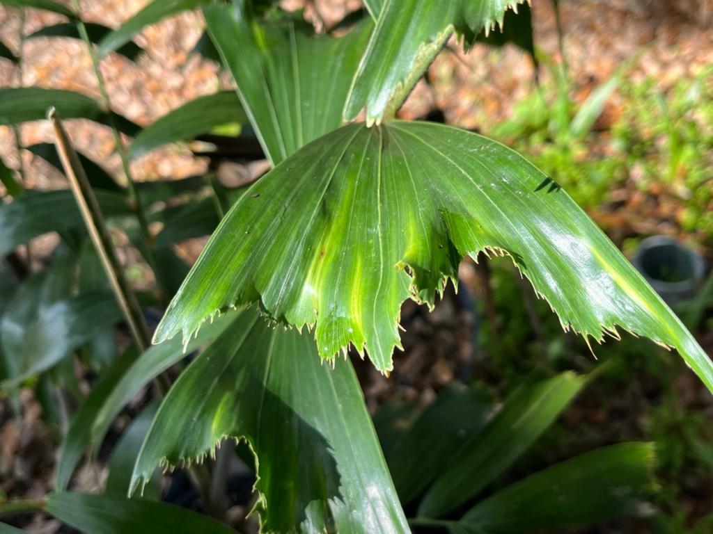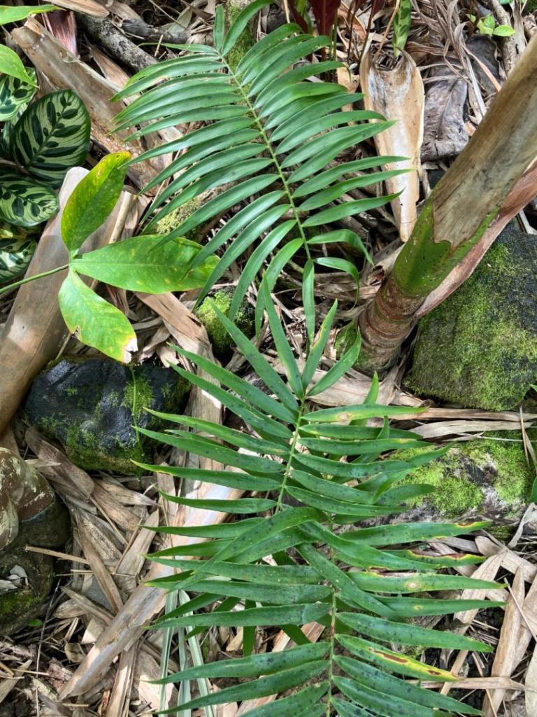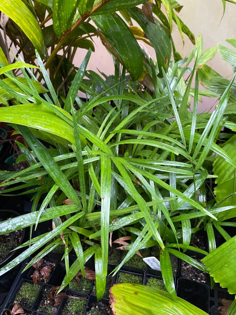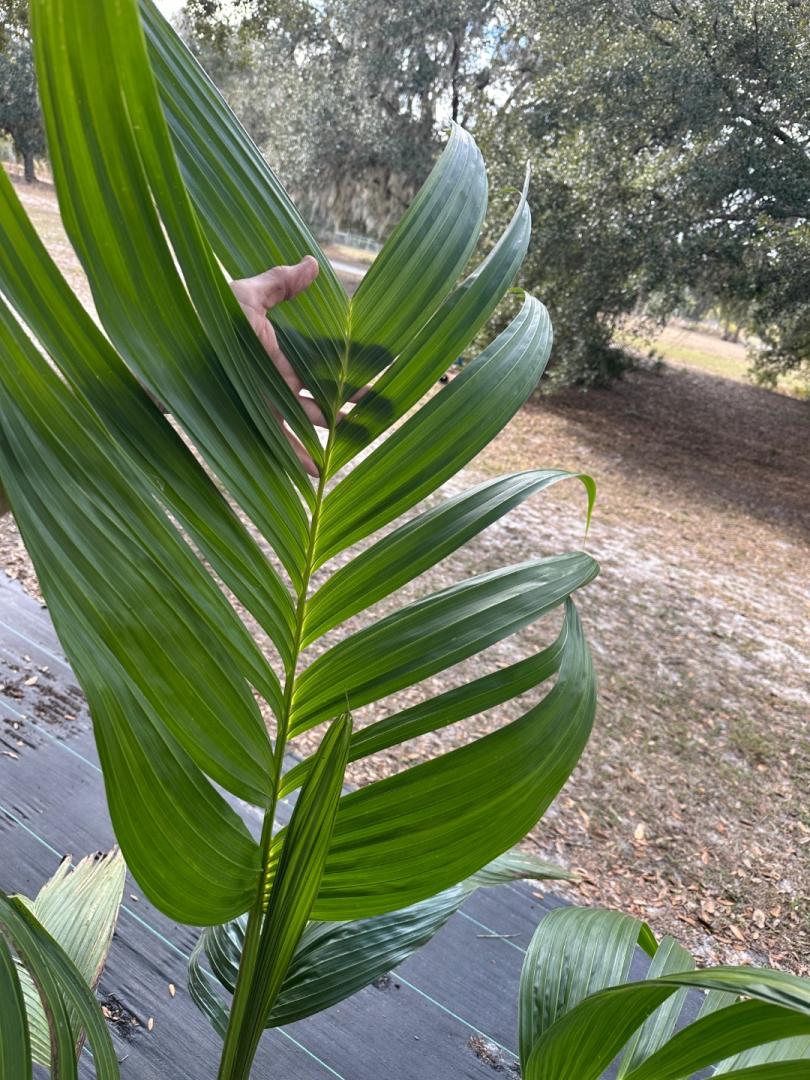 Hello everyone!!! I am very confused about what type of palm this is. I went to the nursery today looking for my first plant to set on my western-facing lanai. Originally, I did NOT want a palm because I am a Florida native who wanted more variety, but I was still open to them as long as the leaves weren’t waxy or sharp. My research led me to find the Areca palm, which turned out to be mostly what I was looking for. I asked one of the workers at the nursery where I could find one, and she told me they were all out!! I continued to look around and stumbled on the tree I ended up purchasing. It was labeled as a cat palm, but it still had the look I wanted, so I didn’t care much about the name. The guy at checkout asked if it was the Areca palm since they don’t label the plants themselves. I knew he would ask, so I showed him the picture labeling it as a cat palm. I took the palm home and downloaded the plant parent app to help me understand what is needed to care for it. The app told me that my palm was actually an Areca, and so did 3 other websites I tried to use to help clear the confusion. Long story short, I am now a proud owner of whatever the heck this is and wanted to ask the experts, not the AI. Feel free to add all the advice you can to care for her. It seems I get mixed answers around every corner. She is currently in the 3-gallon nursery pot I bought it in, which is inside of a clay decorative pot. Both pots have drains. Like I said, I have her situated on a west-facing screened/roofed porch lanai thing. The direct sunlight only lasts for maybe 2-3 hours if that before the other buildings block the direct rays. The porch is always indirectly bright and breezy. I was told not to cut the brown spots and that it’s a fungal infection from overhead water at the nursery. Anyway, thank you for your time! - Lisa Rinna the mystery palm1 point