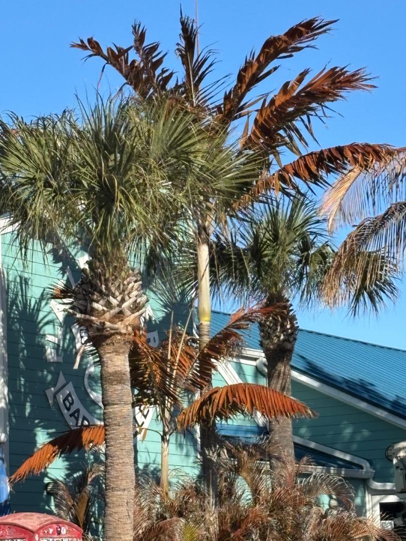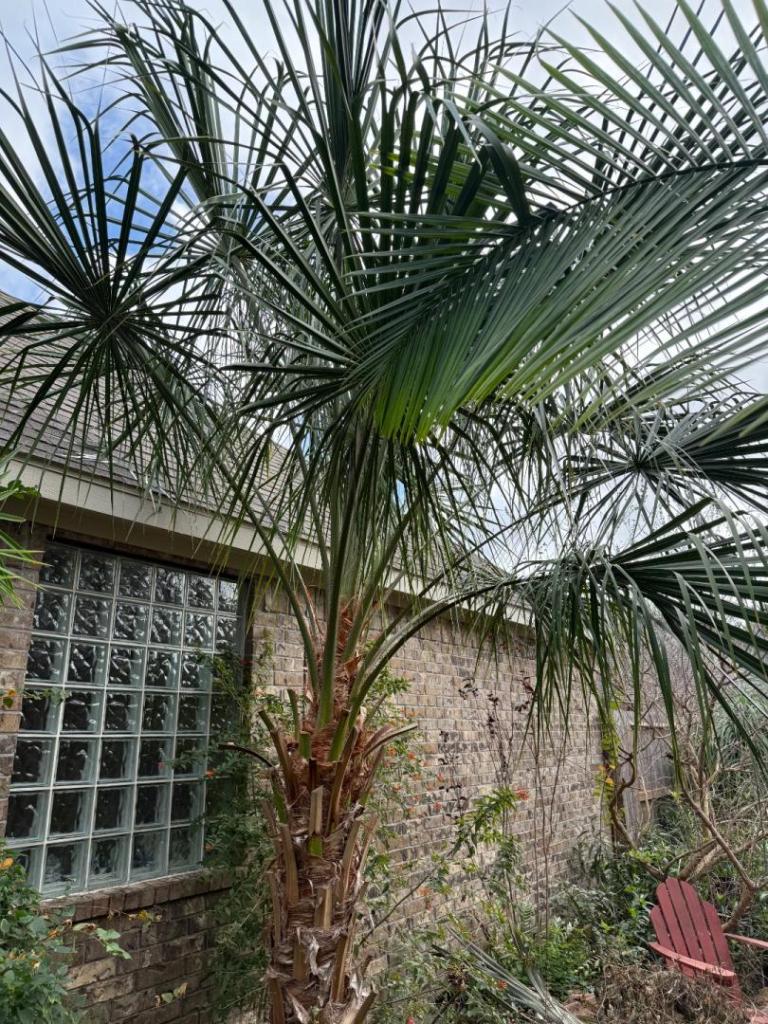 Cibolo TX Post Winter storm report: Temps in my neck of the woods hit 19F or 20F, with some freezing rain. As usual, I think the freezing precipitation was the bigger problem. C. radicalis with East Northeast exposure and partial overhead protection from the eave of the house. P. dactylifera was almost immediately dead. It was about 3 ft in overall height and very healthy going into this event. I covered it, but not until it was already wet. So it's spear pulled almost immediately after the freeze. It's leaves were brown within a few days. I cut the trunk down and there was no living tissue left, despite treating it with hydrogen peroxide within a couple of days of the ice. Butia took a little longer to show damage. It was covered with a large patio umbrella, but it blew off during the storm. It was a couple of weeks before the newest leaves started losing color. Spear pulled, and I have been treating it with H2O2 as well. No signs of a new spear yet. Even my S. mexicanas (No protection) have a leaf or two that have lost their color. This surprised me: My Washingtonia that grows like a weed looks pretty much perfect with no protection: Not all Washingtonians are created equal though. This is what another one just a couple of houses down from mine looks like: Small trachycarpus F x Ws took no damage with a bucket to cover them:2 points