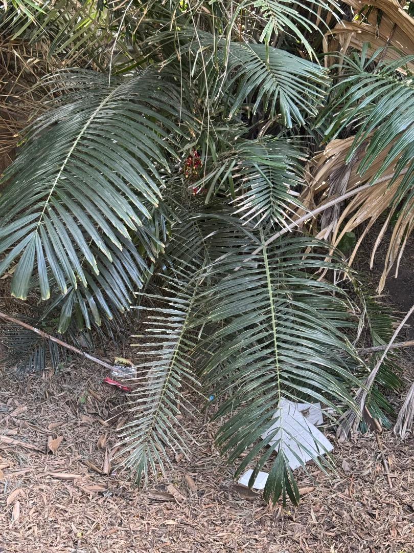Last night I cut down a Caryota acquired as no, but was probably a urens. It was too large for the space and about to get too tall for me to remove myself. The new real estate was already committed to planting one of the Meryta balansae I got from Matt a couple of years back. It had roots outside the small pot it was in. Here is the initial result. I staked it on two sides while it gets established. My wife likes it being in a prominent position along the walkway to the entrance to our home.4 points