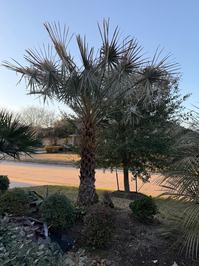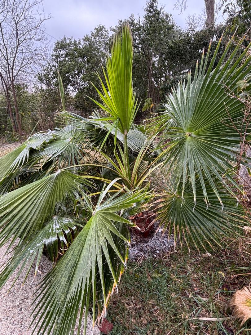 Cibolo TX Post Winter storm report: Temps in my neck of the woods hit 19F or 20F, with some freezing rain. As usual, I think the freezing precipitation was the bigger problem. C. radicalis with East Northeast exposure and partial overhead protection from the eave of the house. P. dactylifera was almost immediately dead. It was about 3 ft in overall height and very healthy going into this event. I covered it, but not until it was already wet. So it's spear pulled almost immediately after the freeze. It's leaves were brown within a few days. I cut the trunk down and there was no living tissue left, despite treating it with hydrogen peroxide within a couple of days of the ice. Butia took a little longer to show damage. It was covered with a large patio umbrella, but it blew off during the storm. It was a couple of weeks before the newest leaves started losing color. Spear pulled, and I have been treating it with H2O2 as well. No signs of a new spear yet. Even my S. mexicanas (No protection) have a leaf or two that have lost their color. This surprised me: My Washingtonia that grows like a weed looks pretty much perfect with no protection: Not all Washingtonians are created equal though. This is what another one just a couple of houses down from mine looks like: Small trachycarpus F x Ws took no damage with a bucket to cover them:1 point