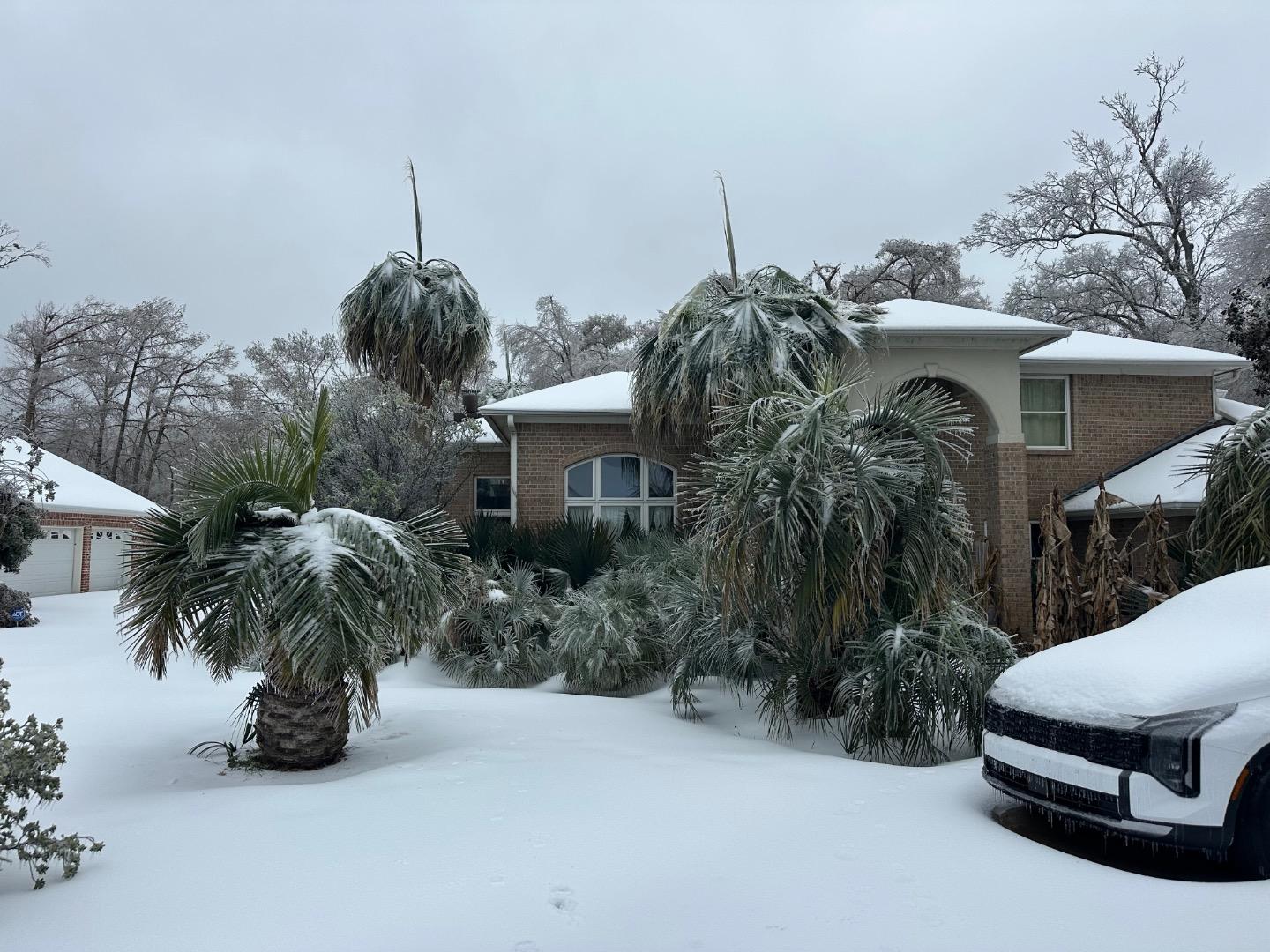 The Encephalartos Hildebrandtii sucker's flush is going pretty well, and the main trunk has a good 4 to 6 visible leaf flush going too. In the background the Munchii has a nice 8-10 leaf flush about halfway done. So this area will soon look like a garden again, instead of a warzone! Speaking of warzones, this is the front NW corner before pruning everything back: And after pruning. In this area I lost a pair of Ravenea Hildebrandtii, a Ptychosperma Elegans, a pair of Cyphophoenix Nucele, and a Gaussia Princeps. Everything else in the area looks like it'll grow back. Surprisingly enough a pair of Syagrus Schizophylla, a clump of 3 Ptychosperma Salomonense (well...2 out of 3 trunks...that ain't bad!) and a Copernicia Hospita all look in survivable condition.1 point