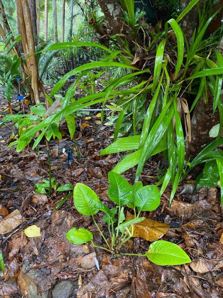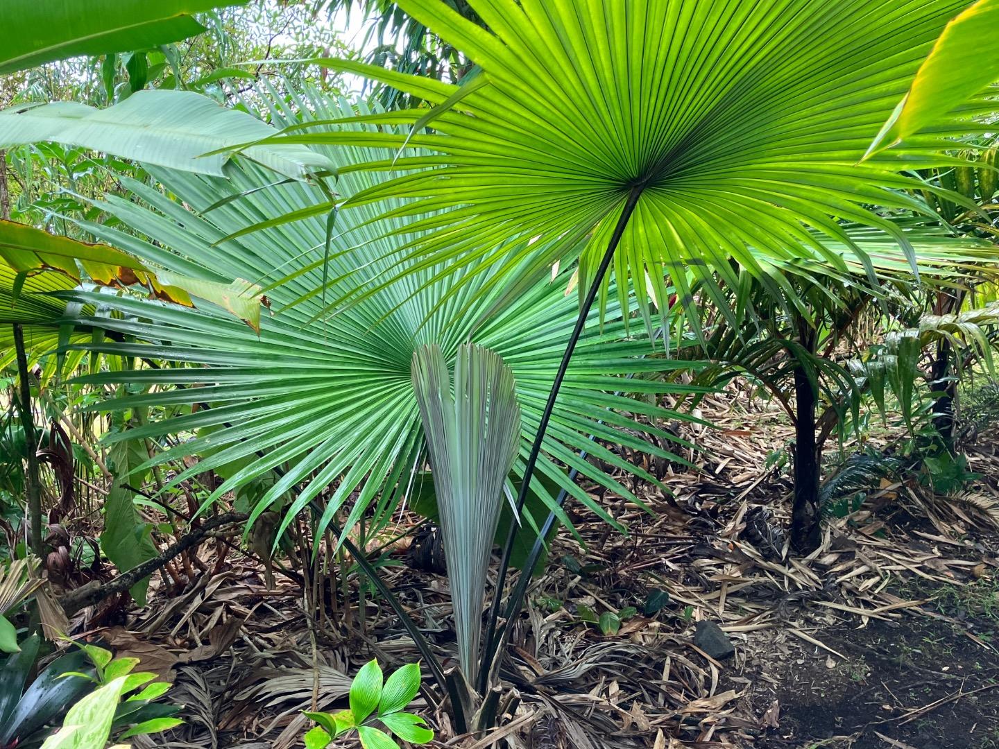 I added this one 3 years ago as a test for a microclimate not planted before. It is a stunning palm taken care of entirely by nature. No human has even checked on this one in 9 months until last week. The previous owner said she probably only climbed down to this spot once or twice during the years she owned the property. Now we have dozens of palms in this area and added two comfortable (Big Box $17.88 each) chairs this visit. They and the PVC pipes with orange flagging tape and aluminum labels are the only signs of humankind here as far as you can see for 365 degrees. The birds and frogs are the only sounds. It may be my favorite spot on the farm. Directions are easy: turn left down the main path from the house by the Metroxylon salomonense that is my avatar. Hold on to the torch gingers for a steep, but short stroll (easy unless it's muddy) and follow the PVC pipes until you're there.... No traffic lights or noise pollution. Can you tell I miss our farm already and I've been back in Virginia less than 24 hours?1 point
