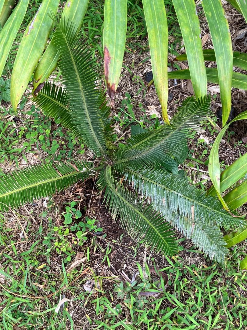And a couple of last photos for today. The two Alfredii are peeking up over the mass of dead Tiger Grass leaves, but the Sabal Mauritiiformis looks pretty good! Encephalartos Ituriensis on the left is pretty bad...: I didn't get a good photo of the Copernicia Baileyana today, but it looks really good. The fans of the below Fallaensis peeking up in the middle are a bit burnt, but the other sheltered ones look fine. The Cycas Multipinnata is defoliated, and the crimson red Dioon Spinulosum on the right is impressive. A small Syagrus Schizophylla in the lower middle looks D-E-D, which is surprising. I thought Schizophylla was pretty hardy. The Furfuracea is crispy as expected, and even the lower left Dioon Merolae isn't happy: And this is the "Whole Leaf" mutant Elaeis Guineensis with complete burn up top. The lower petioles are still green, so hopefully it'll have enough energy to grow back: Here's the somewhat damaged Ptychosperma Schefferi on the left, a wilty Cycas Multipinnata in the middle, and a plant I hadn't even noticed before. In the upper right is a "volunteer" Cycas Micholitzii. I thought it was an offset from the Multipinnata, but it's about 2 feet away! There are some surprisingly good successes out there, like unprotected Syagrus Amara, Sancona and Lorenzoniorum seedlings in good shape. A batch of Kerriodoxa Elegans, Licuala Ramsayi and Distans and Sumawongii, Chuniophoenix Hainanensis and Nana all looking like there wasn't even a cold front. Others are probably already D-E-D like Ravenea Hildebrandtii, Dypsis Cabadae, Syagrus Schizophylla, Cyphophoenix Alba, Nucele and Elegans, and a couple of Burretiokentia Hapala and Viellardii. But then there's a 5' tall Carpentaria Acuminata that looks so far really good...go figure.3 points