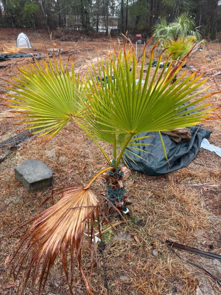 Tonight's low was 33.4F at around 7AM, but with a long 5 or 6 hours in the 30s. The 10 day forecast finally calls for "normal" weather, with lows around 60 and highs in the 70s and lower 80s. I was waiting for the last frost before I started cutting off fronds, because if you take the dead canopy off...the protected stuff underneath just gets torched. I'll probably have to leave a few dead fronds on the Alfredii just for shade protection on the understory palms and cycads. @kinzyjr I'm going to go through the whole yard again and log all the death and destruction...3 points