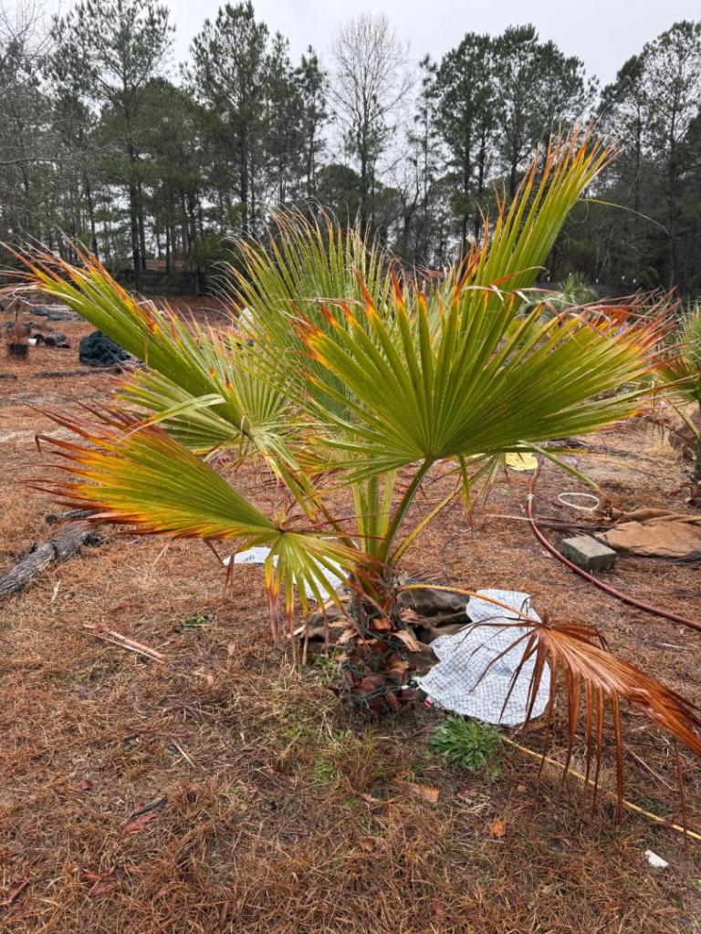 A quick and mostly positive update. Hope those who have had their spirits dashed will find some ideas from the short post below for potential paths forward that doesn't involve only planting a dozen species of plants. The pineapples didn't seem to notice we had a freeze since they were near a concrete block wall. They're getting ready to produce fruit this year. : If you're looking for safer options, but don't want to crimp your planting selections too much, branching and clustering palms like Hyphaene coriacea, Ptychosperma macarthurii, and Allagoptera arenaria are good options that give you more than one shot at coming back. There should be Hyphaene seeds available at the 2026 CFPACS Spring Meeting this weekend: Chrysalidocarpus lutescens comes back even when young. This one is coming back and is not long from seed. Coconuts are on the comeback trail, but aren't out of the woods yet as @pj_orlando_z9b mentioned. Even in the better microclimates in our respective cities, they took a major hit. The stores are running out of Copper fungicide here, so probably good to go get a few bottles of it before gas catches up to it in price. You can see some white fungal growth on the dead tissue. Now that the (hopefully) last cool-off is in the rearview mirror, it's probably best for me to just to remove anything damaged so it doesn't provide a breeding ground for fungus and attract white flies and other bugs. There is another frond behind the one partially visible in the photo that has green on it as well. The Maypan is in similar condition.2 points