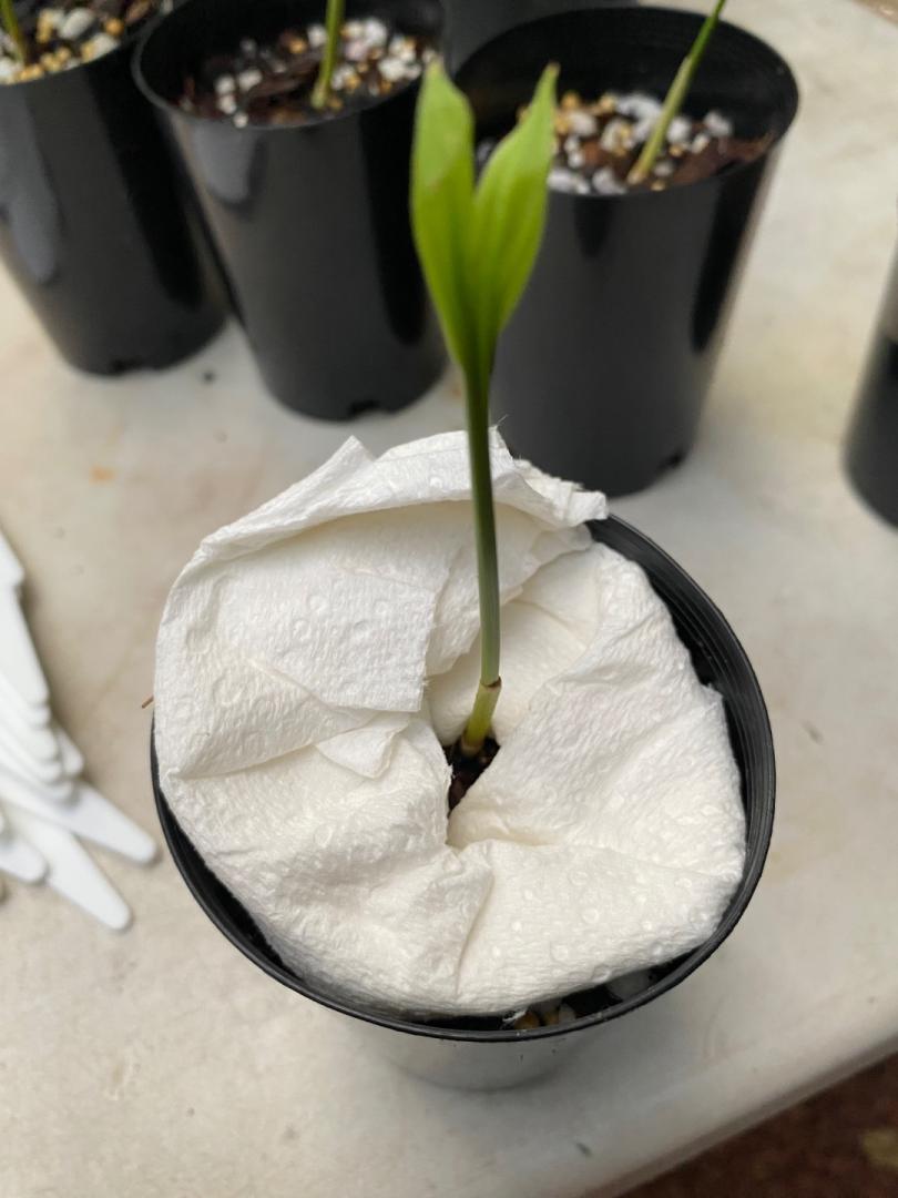 I was cleaning bananas for spider mites - I mean there's just nothing I can do, there's 10 butted up against each other under the better lights - anyway, I hack off any dusty leaves or wherever I see webbing cuz who cares? It'll grow back in like 3 days. Anyway, I missed and decapitated this Mekong Giant and I guess I hit it in the exact right spot, because within literally hours it was pushing this new leaf.2 points