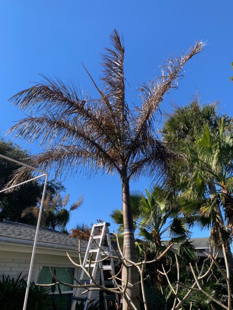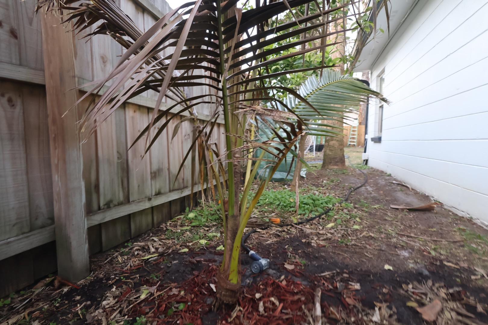 Here's a Bottle palm experiment with trunk cutting. These two have been in the ground since February 2019, and survived a bunch of freezes and defoliations along the way. But they always had Queen canopy before, so this is the first serious cold front since I cut down all the Queen telephone poles. Both of them spear pulled yesterday with a white bottom, but horrendously stinky. The East side one (closest to the camera) I think is pretty much a goner. The fibers around the heart are still white, but seem to be partially disintegrated. It bubbled up a LOT with hydrogen peroxide. I may cut this a bit lower tomorrow, to see if I can get closer to the palm heart: The one on the West has a better chance...maybe. I filled it up with hydrogen peroxide and it also bubbled and spit at me. But on this one the fibers near the heart are fairly firm. I put a random stick down in the center and it only went down about 3 inches or so. I'm guessing my cut was just a few inches above the palm heart:1 point