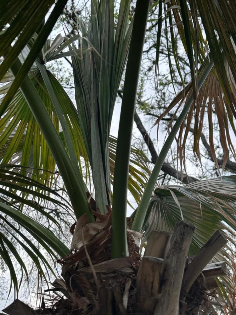 Just to the left of that corner is more carnage, but the majority of that is a multi-headed Cycas Edentata/Litoralis and a monster Encephalartos Whitelockii: The after view is pretty bare, and also covered with a solid inch of the World's Meanest Mulch(TM) from the Whitelockii. The Attalea Cohune double in the center both are pushing new green spears. The current deaths in this area are on the left hand side: 2 out of 3 Chambeyronia Macrocarpa (2 Hookeri dead, 1 Watermelon with a solid spear); a pair of Dypsis/Chrysalidocarpus Basilonga, and in the background a triple Archontophoenix Cunninghamiana. The three small Alfredii haven't spear pulled...yet. I'm not sure if they'll survive. Others like a Wallichia Oblongifolia/Densiflora in the bottom left side lost the bigger fronds but still has a sucker growing green. Just like the small Arenga Westerhoutii, this tiny Attalea Speciosa (from @NatureGirl through @Jdash) was defoliated but just opened up a tiny new leaf! And near the front door I took this photo after chopping off the Encephalartos Ituriensis fronds: And afterwards it's looking pretty bare. I removed a Spindle with 6' of clear trunk, a trunking Archontophoenix Alexandrae and Maxima and double Cunninghamiana, and a triple Gaussia Princeps. On the left side the leaning Beccariophoenix Fenestralis is questionable, but still has a solid spear. The big Ficus Auriculata trunks are bare but there's sprouts at the bottom. The Arenga Hookeriana in the bottom right is also questionable. It had some ground level leaves on a sucker, but they are not in good shape. But there's new flushes in the Cycas on the right and another Diannanensis behind the toasty Ficus Lyrata.1 point