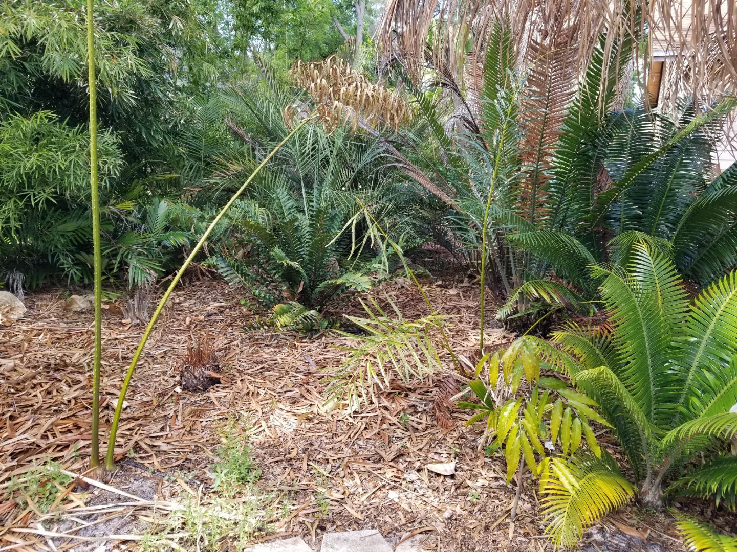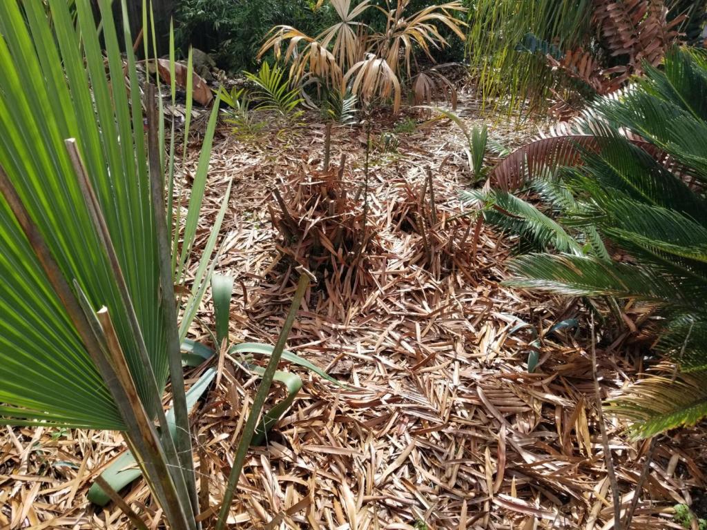I finished up most of the backyard, and have a LOT of free mulch. This stuff is ridiculously stabby. I spread it all around the main rear and SW beds...I bet the local bear won't like it much! I've started calling this the World's Meanest Mulch(TM). Here's the center backyard before pruning: And after pruning and taking out most of the weeds: There's a Copernicia Fallaensis on the right of center, just behind the Sabal Lisa. It took 100% burn, but just opened up a brand new frond. The small Beccariophoenix Alfredii triple in the center back are probably all D-E-D. Two of three spear pulled with 100% frond burn. I'll probably yank these and replace them instead of waiting to watch them turn to mush. The Encephalartos Gratus (bottom left) and triple Ituriensis/Whitelockii (behind the Fallaensis) provided a good 20+ foot diameter layer of the World's Meanest Mulch(TM). I made it by clipping off the ~10' tall frond and then using the hand pruners/loppers to just knock the leaves off the rachis: I'm impressed by the Fallaensis. The new fan was a growing spear during the cold front, and looks almost perfect. The old fans were burnt, but the stems/petioles are mostly green. There's another green spear tip about halfway up the left side of the below photo. Despite not being super "leaf hardy" the palm skated right through 22.5F...4 points
