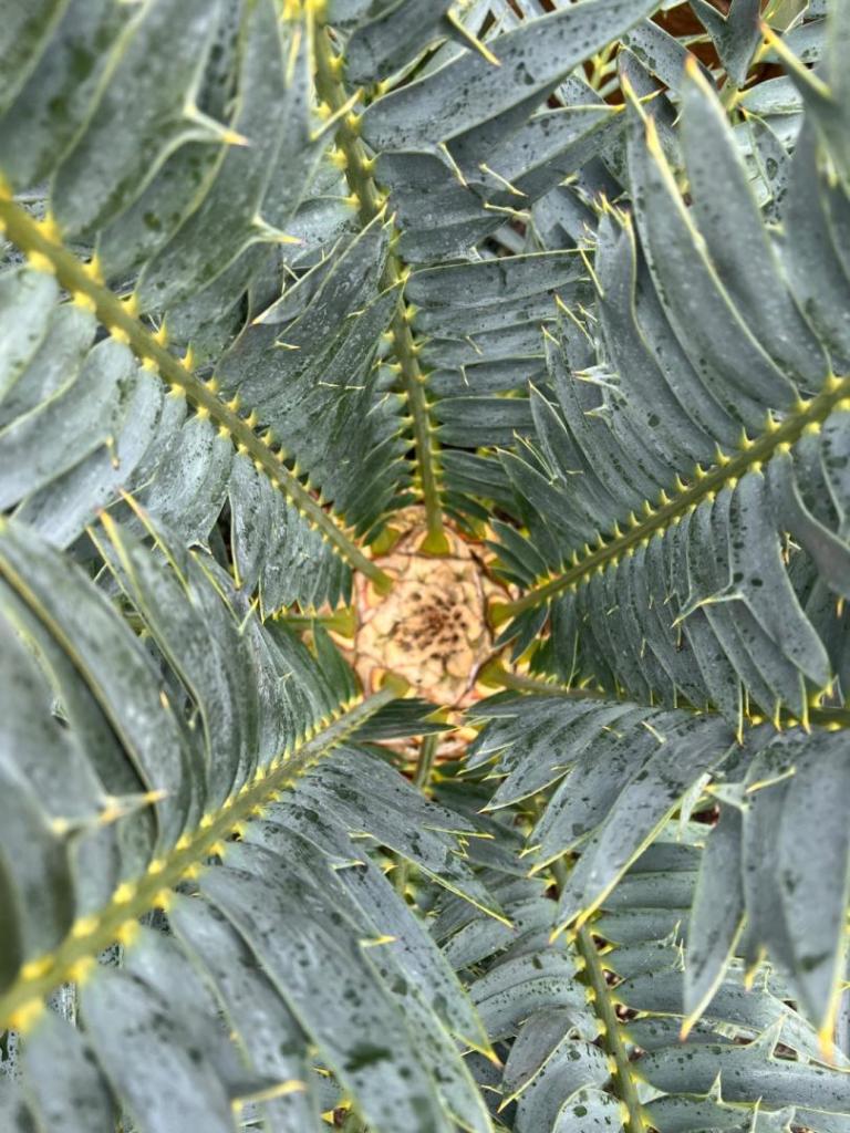 The Encephalartos laurentianus flush is progressing better for this time of year than normal. The mild weather has allowed the flush to emerge without wind and rain damage. Sometimes the portion of the leaves above the adjacent 6' block wall succumb to wind shear, but not yet at least on this flush.1 point