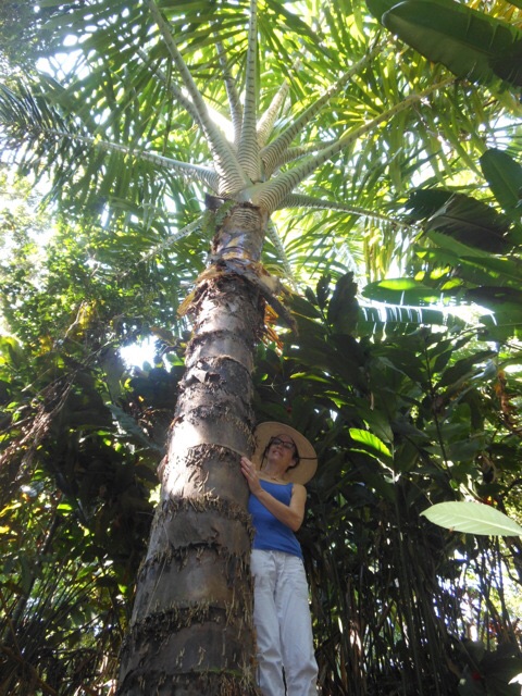 Brad, I don't have any beautiful lichens covering the roots. I do have abundant moss on the trunks concealing the spines. The roots are brown, but seem to take on a slight violet cast at twilight. The crowns are about 20' up (6 m). It is hard to get a good exposure of the fruit with the glare of the sky interspersed with the shaded undersides of the fronds. The cool roots are a consolation prize when the wonderful entire fronds disappear into the canopy. Growing in about a foot (30 cm) of black cinder, plenty of mulch and slow release 22-7-14 three times a year. Many palms suffered with the miserable dry weather this past year, but I didn't notice any distress with these. I wonder if a phalanx of these roots around the perimeter of the property could actually deter pigs. For some mysterious reason, I have not had a pig attack in over six months. Gotta be a record. I see them on the roads near my house frequently, but so far they have held their fire.2 points