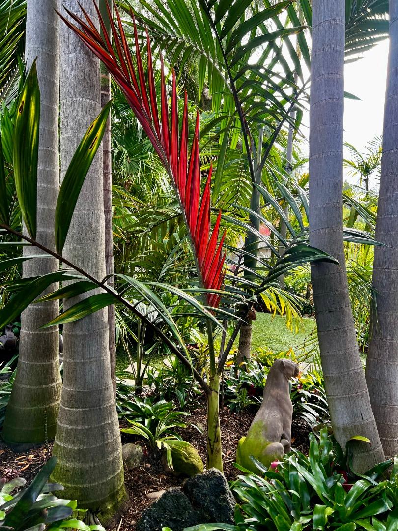 Few palms make a first impression as does Cyrtostachys renda. Many remember when they first laid eyes on a picture or the real thing. It's love at first sight until they become informed they can't grow it unless they care to move. IMO, almost as impressive and a much easier grow is Areca vestiaria. I could get these to last until Feb. outside in SoCal before they gave up the ghost. I believe they failed due more to cumulative cold as opposed to one cold unbearable night. I would think that would give them half a chance in Central Florida. Have you guys tried it there? Or has anyone in SoCal managed to get one through a winter? Although lacking the intense color of the 'Sealing Wax' they never the less have plenty of color. They are quite variable, ranging from solitary orange to profusely suckering red/maroon. They have a more interesting shape to the frond, and variable colors in the emergent one. And in addition they have cool stilt roots. Although almost as common in Hawaii now as 'Sealing Wax,' I hope they are being aggressively tried elsewhere. A few pics to follow. First one is more to the less suckering orange range of the scale.1 point