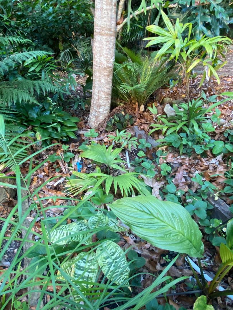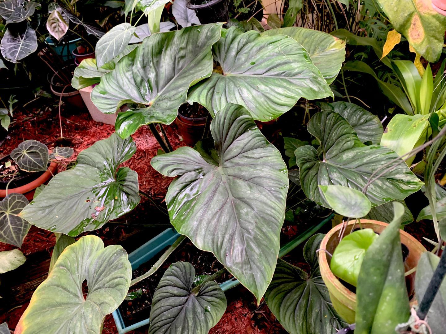 Between the heat wave, violent storms with tennis ball sized hail stones, my crumbling spine, a sick cat and 6 of the little dogs all needing dental work, need I say I have not been buying plants for a long time. Today I needed a fitting to put on the garden hose and ventured into the danger zone , Bunnings. (a hardware and garden chain of stores in Australia) Even though I stayed away from the plant section, I went in for a peek, just to look of course. Well I found Licuala grandis, in 20cm pots, about 1 metre in overall height for 22.95 !! I have 3 or 4 of them already but at that price they were a give away and so I took. Then I saw a Thai Constellation monstera, only in a 13 cm pot and 40 cm overall height, but for $29 I wasn't saying no to that as I have wanted one for ages but wouldn\t pay $300 which is what the slightly larger ones cost. It was money that should have gone on debts but I felt so good about getting new plants and great bargains that to hell with being responsible for once. Peachy1 point
