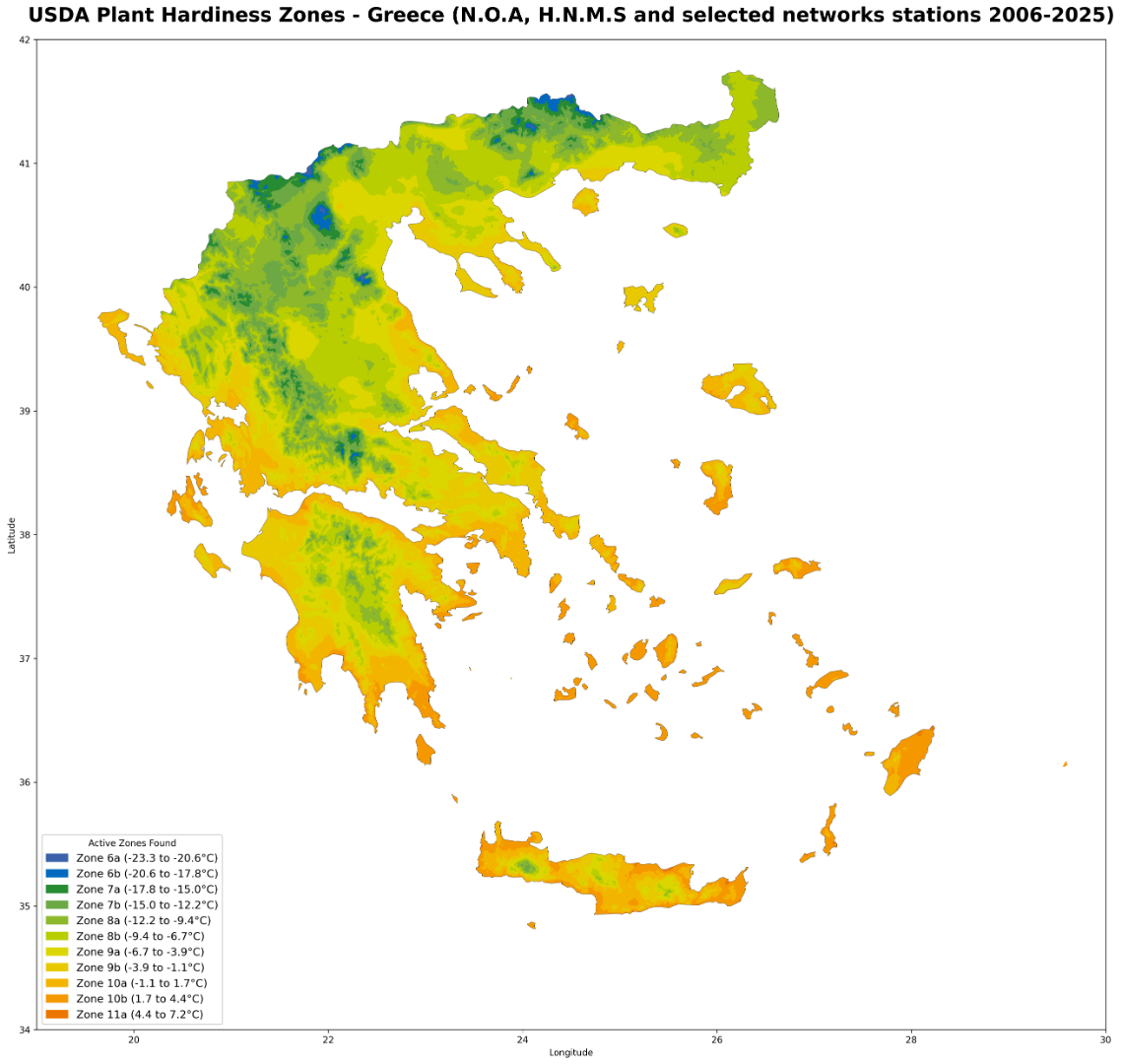 Hello all! I have created a high-resolution USDA Plant Hardiness Zones map for Greece, based on climate data from the period 2006-2025. The aim of this work was to create the most detailed depiction of hardiness zones, utilizing modern geospatial analysis techniques to capture the complex geomorphology of the Greek territory. Methodology & Data: Primary Data: The analysis was based on annual minimum temperatures from the meteorological station networks of NOA, HNMS and selected stations from reliable networks with strict operating standards (IMS). Geospatial Analysis: A combination of Multivariate Regression and Spatial Interpolation (Regression-Kriging) was used. The model factored in latitude, distance from the sea, and altitude. Digital Elevation Model (DEM): A high-definition DEM (~300m) was applied for the precise application of the Lapse Rate. This allowed for the separation of warm coastal zones from colder hinterlands at the pixel level, highlighting microclimates lost in previous approaches. Results & Observations: The map clearly depicts the range of zones, from the cold Zone 6a in the mountains, to Zone 11a (>4.4°C). Of particular interest is the spatial distribution of Zone 11a, which was identified based on the data: In the Dodecanese (Extensively in Rhodes, as well as in Kasos, Karpathos, Kastellorizo). In Monemvasia, which constitutes the only location where Zone 11a appears on the mainland. Crete (Northern and Southern coasts) and Gavdos. Cyclades (Amorgos, Koufonisia, Sifnos). In Hydra, which represents a remarkable microclimate and constitutes the northernmost point of Zone 11a occurrence in the entire Mediterranean. See the map in full resolution in the attached file.1 point