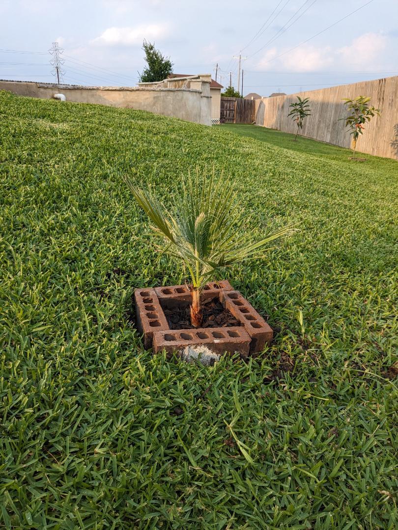 It is pushing those bricks out pretty badly. I have really only left them to protect the trunk from the weed trimmer. It is big enough now though that the leaf bases would be plenty of protection.1 point