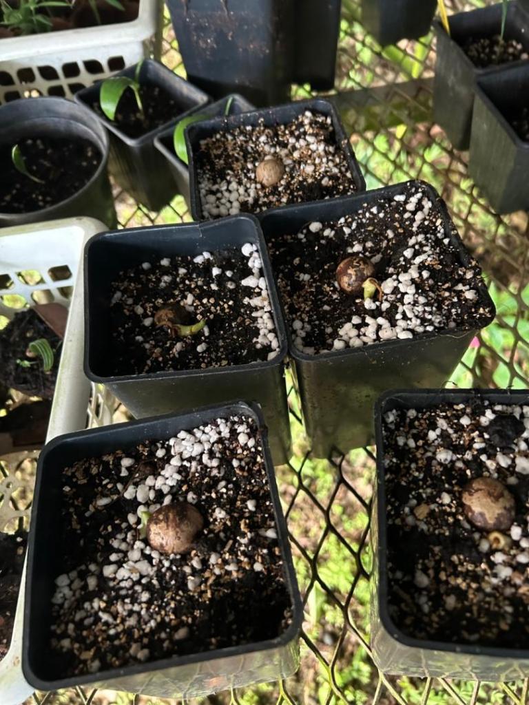 Got my grubby hands on these two hybrids from Floribunda. Anyone else trying them? Or growing them already? This first one is a prestoniana hybrid of unknown pollen parent. And these are the decipiens F2 hybrids. Jeff says these are from a clustering, smaller palm and that it is fast growing. Lastly, one of my decipiens nearby looking good with a new spear not far from opening11 points