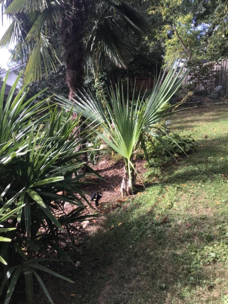 The 11 year old Trachy really exploded this season. It’s also beginning to bend south toward the sun. I didn’t do any before or after measurements but it seems to have grown 1’ or maybe a bit more. The top 1/3 of the canopy is all new. The winter help it gets are some lights wrapped around the crown and only turned on in teens or single digits. I also wrap the base of the trunk in black landscaping cloth to draw in the sun’s radiated heat on sunny days. The Medi grew extremely well, too. Going to have to get creative with the protection this winter. It seems t be outgrowing what I’ve used so far. The McCurtain is really quite a no protection wonder. Literally zero winter damage with zero cover for 8 or 10 winters. It’s got a blue tint to it I really like. The Needles just keep on growing with zero protection. The small Trachy that will be treated like the big one. And the Brazoria…not the greatest for my region as the leaves damage starting in the teens but it pushes new ones out pretty fast and they’re huge! Oh yeah…that “accidental Butia” that turned into a seeded Brazoria (see lower left bottom corner of the small Trachy pic) I’ll just cover with leaves when temperatures hit the 20’s F. Hope everyone’s summer produced a lot of growth.10 points