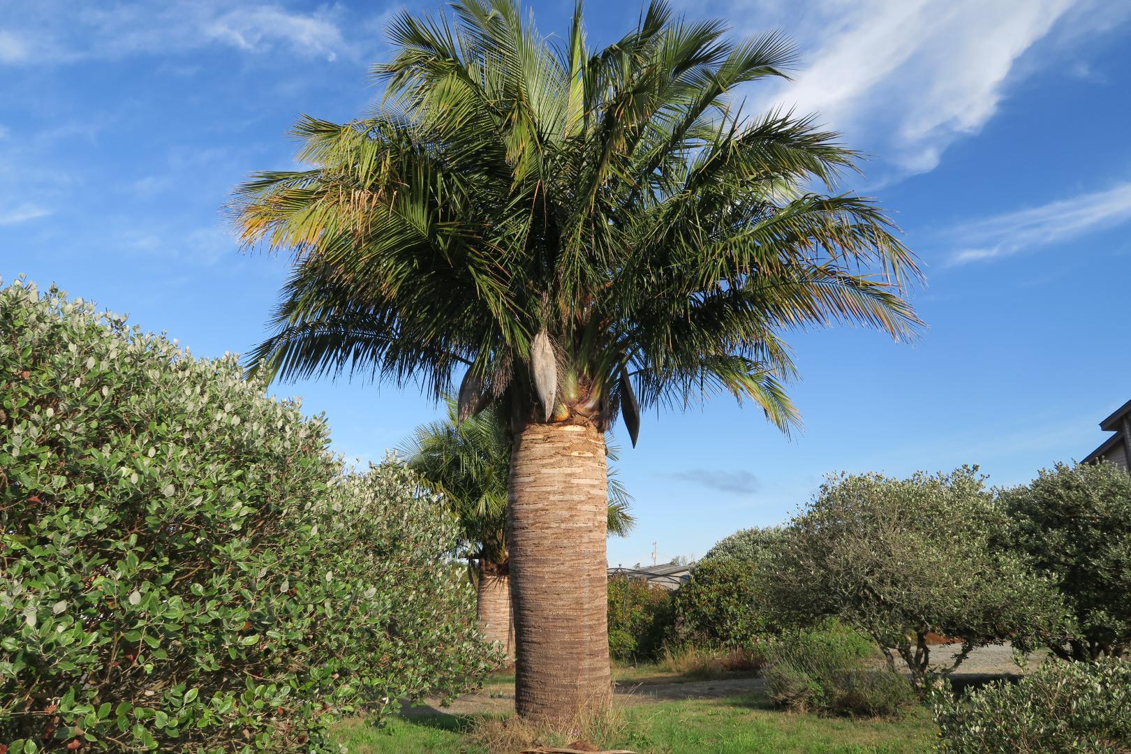 Updadate of 2022 post on growth of Jubaea Chilensis in Oregon. Current pictures of Jubaea 3 years later are show classic bulge in trunk with additionnal 3 to 5 foot verticle growth. Large Jubaea began producing fruit and nuts in late 2024 at about same time the trunk began to slowly taper out of the bulge.13 points
