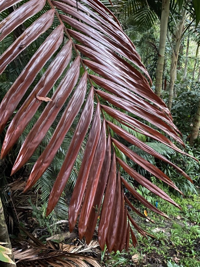 As the sun fell lower in the sky, something red was lit up toward the east. What could it be? Grabbed the phone and went to see. A sight I have never witnessed before, the unveiling of a fresh inflorescence of Loxococcus rupicola -- and wow, was it ever RED! Below you can see what caught my eye. Closer -- evidently I was disturbing a pair of Madagascar geckos -- can you find them? Below you can see the formed seeds on another Loxococcus rupicola. I sometimes have trouble remembering the name of this palm. My trick is to start with Coca-cola and then it falls into place.3 points