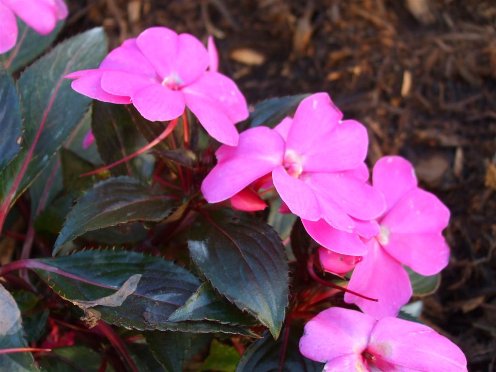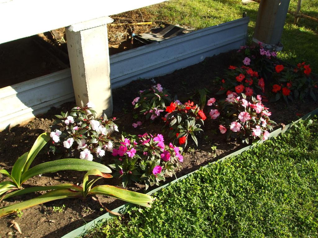 I used to grow these a few years ago until a wicked grub came along, brought his friends and they literally ate the entire 15 or so plants I painstakingly acquired from various nurseries over a long period, a real NG impatiens collection it was. So I gave up, until yesterday when I just couldn't resist and bought 5 plants. I was mulching with some red cypress and I decided to triangle a bed using the points of 3 palms and then stick the colour in the middle.