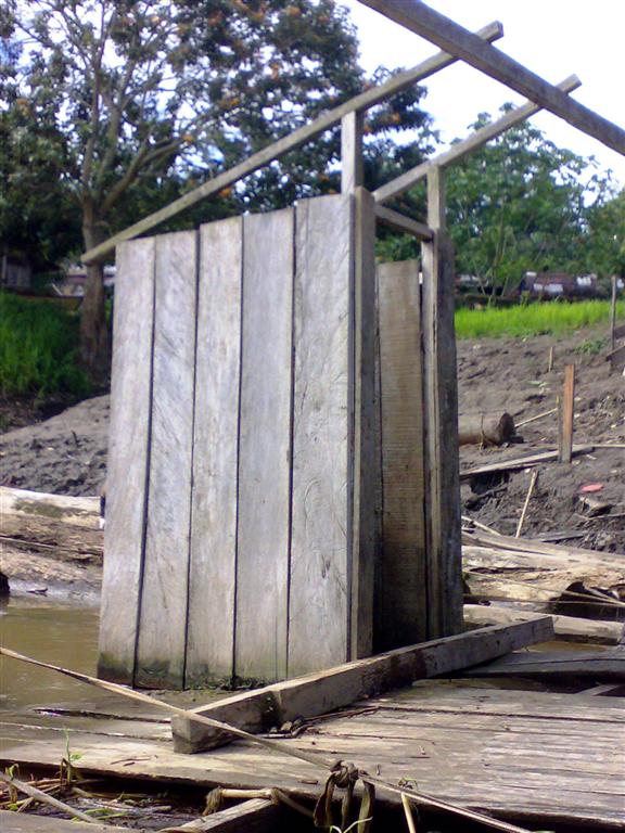 The guy in the photo is Manoel one of my associates on the trip. He is the guy that manages the barge operations. He is quite an Amzonian character. As we continued up the river the main vegetation is what we call here in Amazonas, varzea, or flooded river plane forest of muddy water rivers. The boat stopped at several places along the way. The first one is where river traffic clears customs in Peru. We did not have to do anyting as we had already done that in the village of Santa Rosa when the boat left. The river bank is river silt, mud in essence and does not make boarding or leaving the boat an easy trip. The Capitania is where the barges check in and Aduana is customs. As you can see the customs don't look too busy. Since there were no easily visible rest rooms I sort of wandered out behind the area into a banana grove to take care of this necessity. I did find this rest room, but it did not look too inviting.