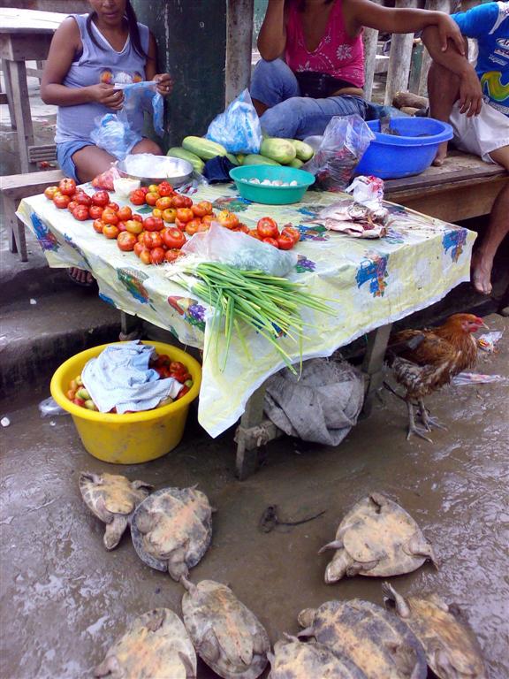 The next stop was the town of Pevas. We did not get to see the town only the river front. Which was an experience. They were selling fruits and vegetalbes at the street fair market. And, there were some women selling turtles and turtle eggs. I bought some regional tomatoes from them and took their picture. I figured the regional tomatoes would do well in the climate of Manaus as they grown them there. Going up the river bank to the market was an experience just to get to solid ground. But, I did get my booty of tomatoes.