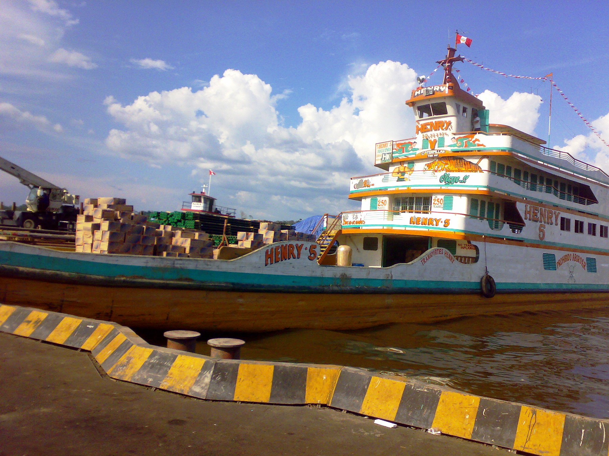 Manoel and I went to the port to check out how the operation of unloading the barge will be done. There is a lack of infra structure at Iquitos port to load and unload containers. But, it is possible. The in bound containers with sugar or cooking oil have to be unloaded manually on the barge. The cargo comes loose loaded in the containers. With 82 containers this will take a while. Then the empty containers are lifted onto the floating pier and loaded with the lumber bundles. The whole operation should take about 10 days. After we explained to the port what we were doing we walked around the port. There is a quite a bit of pipe moving in now for petroleum exploration. The port will become real busy once the oil startes being drilled in large scale. There are only two ways to Iquitos. One is from Lima to Pulcapa by road and then down the river. The other is up the river from Manaus. They are going to need a lot of oil barges built to support the oil field development. The area being explored for oil is up the rivers toward Ecuador. The barges covered in tarps are loaded with wood that is going to be shipped down to Tefe in Amazonas state of Brazil to be loaded on the vessel to Tampico, MX, Houston, and Port Everglades. The vessel only can reach Iquitos during the high water for six months. Even then it can not reach the pier and has to be unloaded onto barges in the river and then transfered to the port. There were some intersting tourist river boats next to the port.