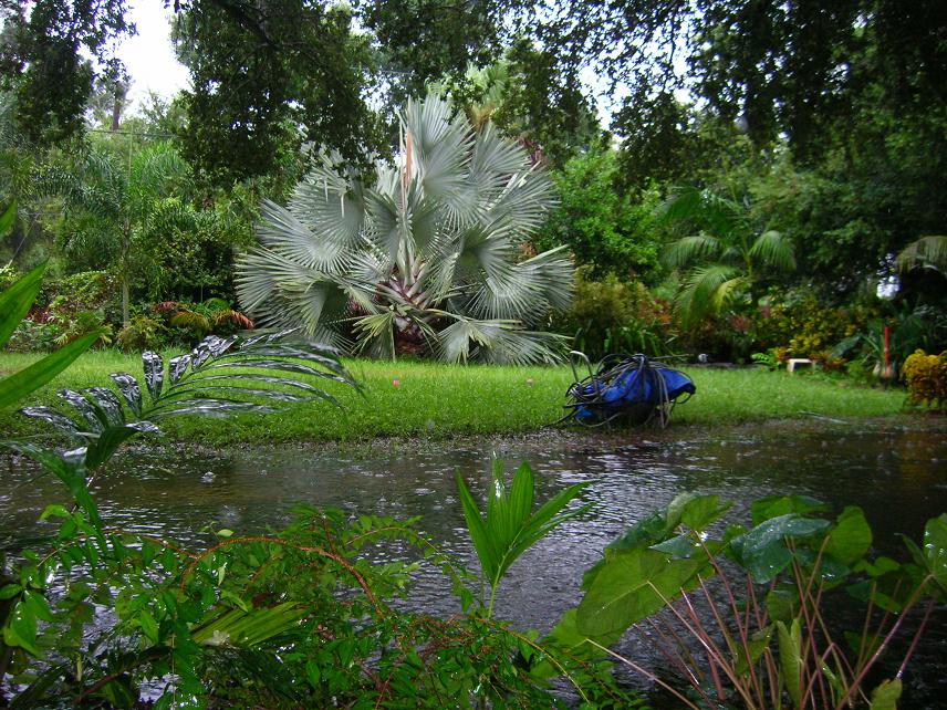 my bigger bismark sitting high and dry. At least the root crown is! My yard has never flooded in the 13 years I have lived here. Tropical Storm Fay just sat on top of us and rained constantly. I have many palms that are leaning. The winds didn't get that strong, only around 50 mph at the strongest. But tons of rain.